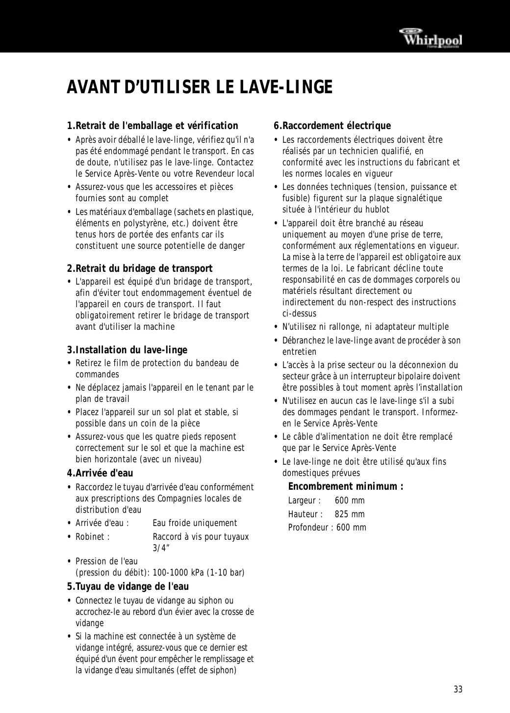 - Pression de l'eau (pression du débit): 100-1000 kPa (1-10 bar) Encombrement minimum : Largeur : 600 mm Hauteur : 825 mm Profondeur : 600 mm 5.Tuyau de vidange de l'eau