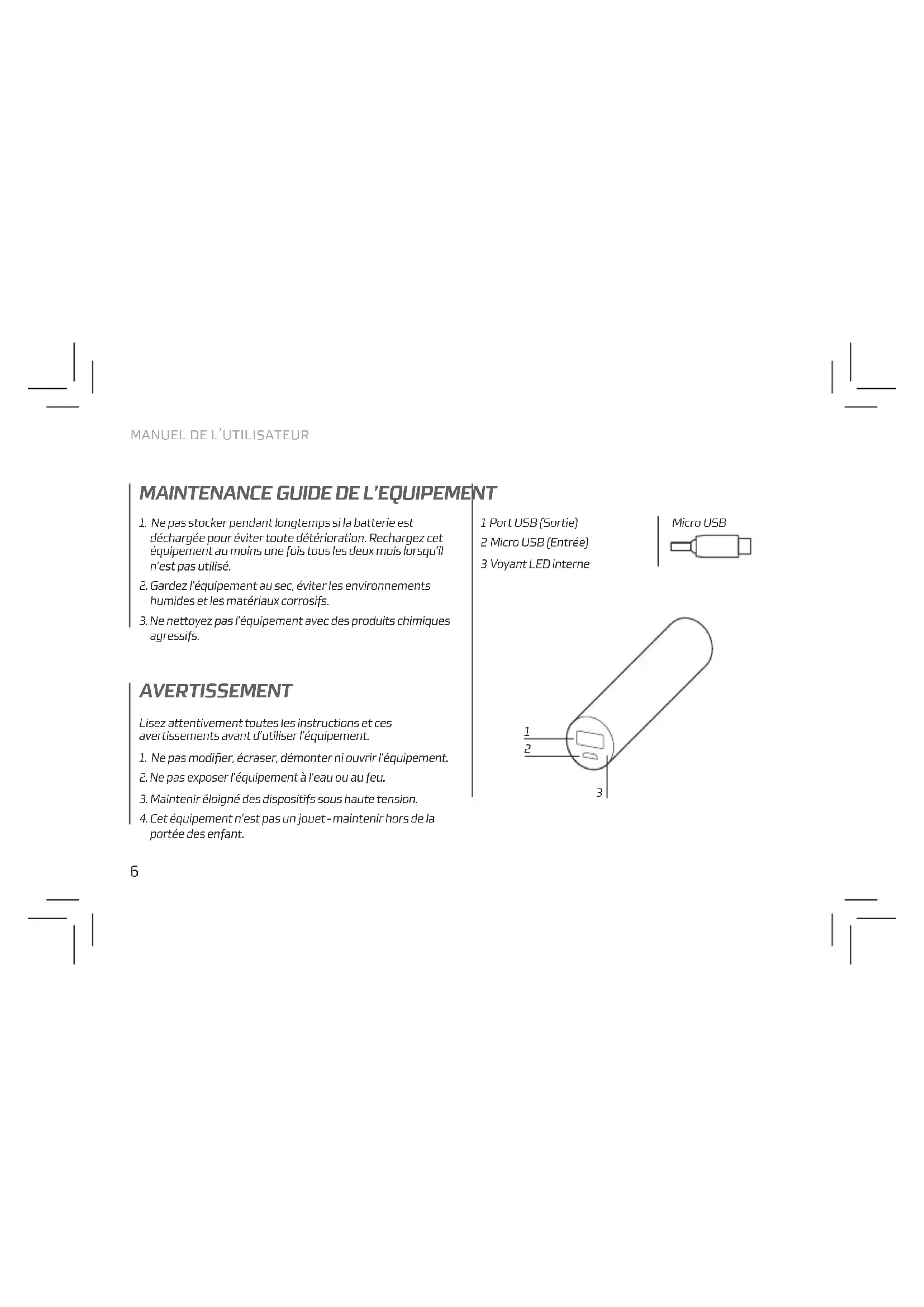 1 Port USB (Sortie) 2 Micro USB (Entrée) 3 Voyant LED interne