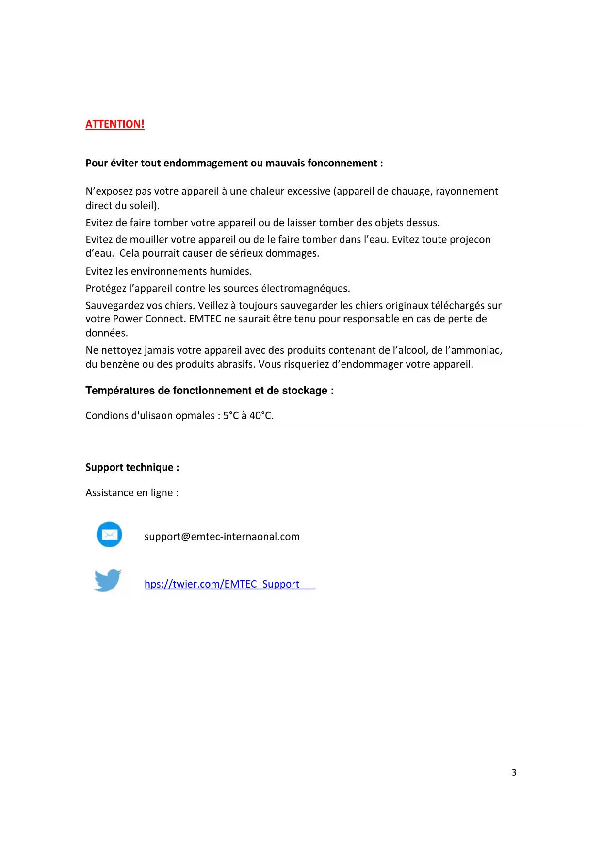 ATTENTION! Pour éviter tout endommagement ou mauvais fonctionnement : N’exposez pas votre appareil à une chaleur excessive (appareil de chauffage, rayonnement direct du soleil). Evitez de faire tomber votre appareil ou de laisser tomber des objets dessus. Evitez de mouiller votre appareil ou de le faire tomber dans l’eau. Evitez toute projection d’eau. Cela pourrait causer de sérieux dommages. Evitez les environnements humides. Protégez l’appareil contre les sources électromagnétiques. Sauvegardez vos fichiers. Veillez à toujours sauvegarder les fichiers originaux téléchargés sur votre Power Connect. EMTEC ne saurait être tenu pour responsable en cas de perte de données. Ne nettoyez jamais votre appareil avec des produits contenant de l’alcool, de l’ammoniac, du benzène ou des produits abrasifs. Vous risqueriez d’endommager votre appareil. Températures de fonctionnement et de stockage : Conditions d'utilisation optimales : 5°C à 40°C. Support technique : Assistance en ligne :
