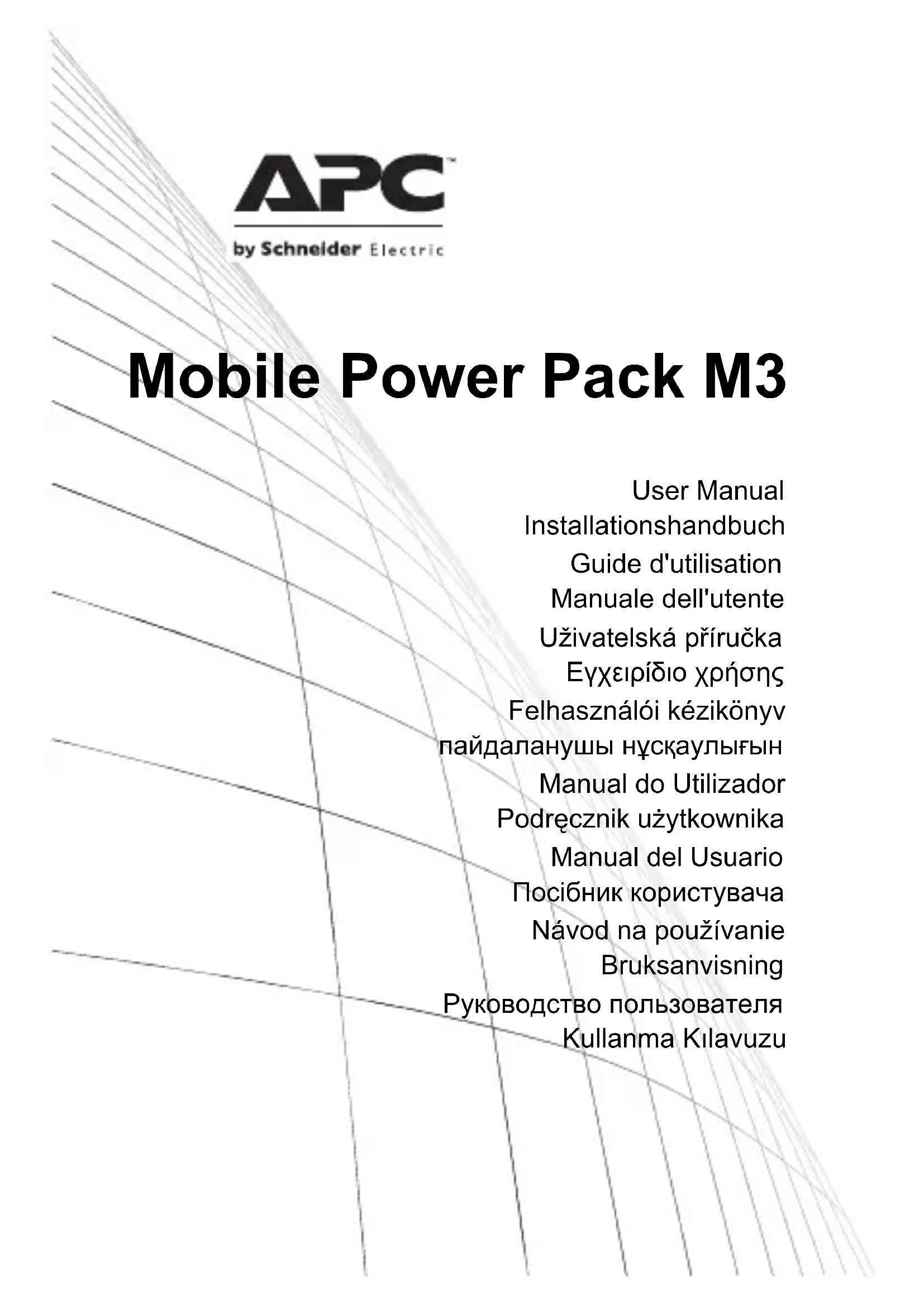 F)© 2015 APC by Schneider Electric. APC, le logo APC sont la propriété de Schneider Electric Industries S.A.S. ou de leurs filiales. Toutes les autres marques commerciales sont la propriété de leurs détenteurs respectifs. FR 990-5593 01/2015 Français Dépannage Assistance clientèle mondiale d'APC by Schneider Electric Pour en savoir plus sur l'assistance client spécifique à un pays, consultez le site web de APC by Schneider Electric, www.apc.com. Problème / Cause possible Solution Le Power Pack mobile ne se charge pas Le chargeur USB fonctionne peut-être mal ou l'ordinateur est en mode veille. Essayez un autre chargeur USB ou sortez l'ordinateur du mode veille. Les contacts du connecteur et du câble micro USB sont usés. Essayez un nouveau connecteur micro USB Le Power Pack mobile ne peut pas charger certains appareils. Le Power Pack mobile n'a pas pu reconnaître ou détecter les appareils connectés. Certains câbles USB de rechange peuvent ne pas fonctionner correctement avec le bloc-batterie M3. Pour résoudre ce problème, appuyez sur le bouton d'alimentation du M3 afin de commencer à charger l'appareil. Si le bloc-batteries ne charge toujours pas votre appareil, remplacez le câble de rechange par le câble d'origine fourni avec votre appareil. Un état de surcharge est apparu et la LED orange du M3 clignote. Le M3 charge un appareil et son courant de sortie USB dépasse la plage spécifiée. Débranchez l'appareil en cours de chargement du power pack M3. La durée de vie de la batterie du Power Pack mobile a expiré ou une panne s'est produite. En cas de panne du système, contactez votre revendeur local APC by Schneider Electric ou une agence de services agréée APC by Schneider Electric.Italiano Contenuto Informazioni di carattere generale e per la sicurezza Leggere attentamente il presente manuale prima di utilizzare il prodotto e conservarlo per riferimenti futuri.