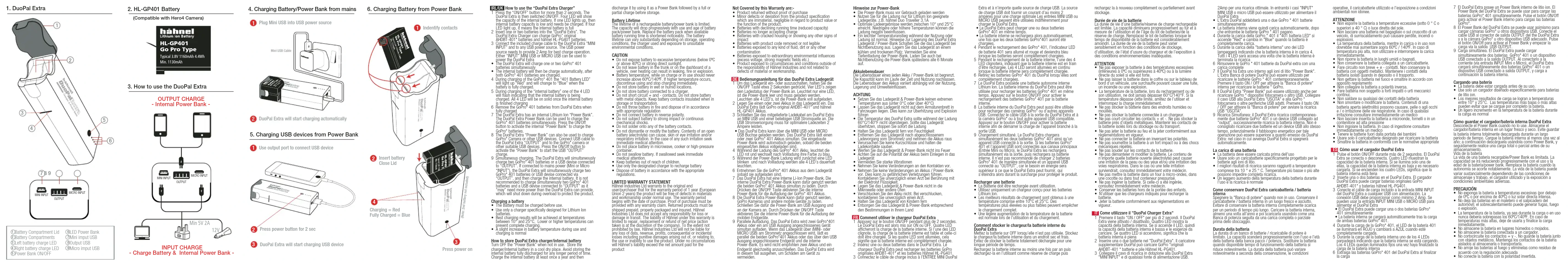 - Entsorgen Sie das Ladegerät & Power-Bank entsprechend den Bestimmungen in Ihrem Land FR Comment utiliser le chargeur DuoPal Extra 1 Appuyez sur le bouton ON/OFF pendant plus de 2 secondes. Le DuoPal Extra est alors mis sur ON ou OFF. Quatre LED afficheront la charge de la batterie interne. Si l’une des LED clignote, la charge de la batterie interne est faible et celle-ci doit être chargée. Si les quatre LED sont allumées, cela signifie que la batterie interne est complètement chargée. 2 Insérez une ou deux batteries dans le DuoPal Extra. Le chargeur DuoPal Extra peut recharger les batteries GoPro originales AHDBT-401* et les batteries Hähnel HL-PG401. 3 Connectez le câble de charge inclus à l’ENTREE MINI DuoPal Extra et à n’importe quelle source de charge USB. La source de charge USB doit fournir un courant d’au moins 2 ampères pour une charge optimale Les entrées MINI USB ou MICRO USB peuvent être utilisées indifféremment pour charger le DuoPal Extra.
