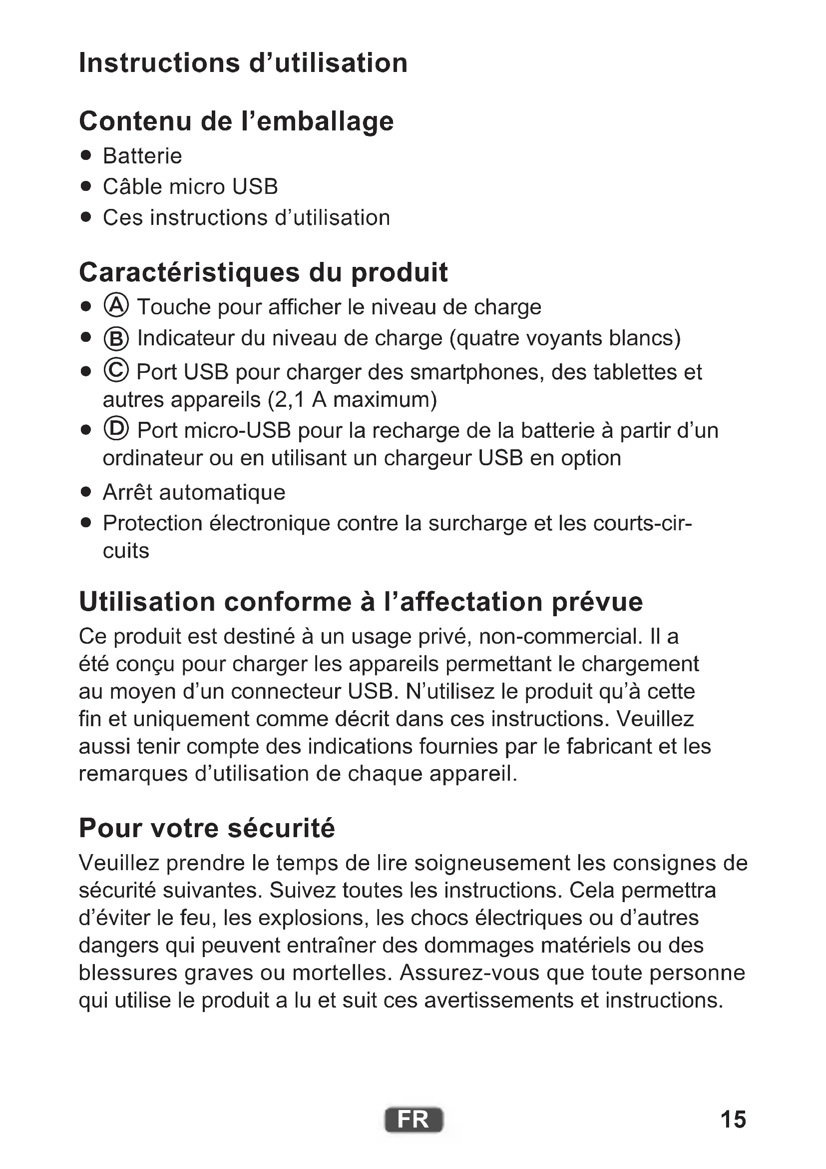 Protection électronique contre la surcharge et les courts-cir- cuits Utilisation conforme à l’affectation prévue Ce produit est destiné à un usage privé, non-commercial. Il a été conçu pour charger les appareils permettant le chargement au moyen d’un connecteur USB. N’utilisez le produit qu’à cette n et uniquement comme décrit dans ces instructions. Veuillez aussi tenir compte des indications fournies par le fabricant et les remarques d’utilisation de chaque appareil. Pour votre sécurité Veuillez prendre le temps de lire soigneusement les consignes de sécurité suivantes. Suivez toutes les instructions. Cela permettra d’éviter le feu, les explosions, les chocs électriques ou d’autres dangers qui peuvent entraîner des dommages matériels ou des blessures graves ou mortelles. Assurez-vous que toute personne qui utilise le produit a lu et suit ces avertissements et instructions.16