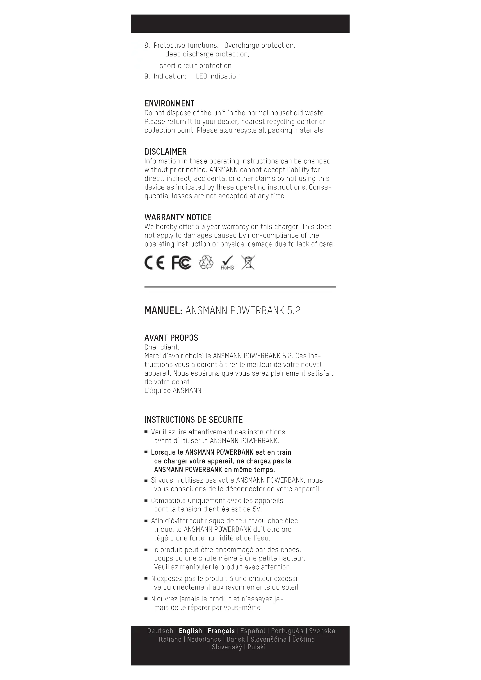 Veuillez lire attentivement ces instructions avant d’utiliser le ANSMANN POWERBANK. Lorsque le ANSMANN POWERBANK est en train de charger votre appareil, ne chargez pas le ANSMANN POWERBANK en même temps. Si vous n’utilisez pas votre ANSMANN POWERBANK, nous vous conseillons de le déconnecter de votre appareil. Compatible uniquement avec les appareils dont la tension d’entrée est de 5V. Afin d’éviter tout risque de feu et/ou choc élec- trique, le ANSMANN POWERBANK doit être pro- tégé d’une forte humidité et de l’eau. Le produit peut être endommagé par des chocs, coups ou une chute même à une petite hauteur. Veuillez manipuler le produit avec attention N’exposez pas le produit à une chaleur excessi- ve ou directement aux rayonnements du soleil N’ouvrez jamais le produit et n’essayez ja- mais de le réparer par vous-même Deutsch | English | Français | Español | Português | Svenska Italiano | Nederlands | Dansk | Slovenščina | Čeština Slovenský | PolskiUne modification ou un remodelage du produit peuvent altérer la sécurité du ANSMANN POWERBANK. Cela peut également causer des préjudices aux utilisateurs. L’appareil ne doit pas être utilisé par des enfants ou des personnes à capacités physique, sensorielle ou mentale réduites. De plus, les personnes novices dans son utilisation doivent lire entièrement ces instructions ou en être informées avant l’utilisation Si les instructions de sécurité ne sont pas su- ivies, cela peut causer des dommages au ANS- MANN POWERBANK ou à l’appareil connecté ainsi que des préjudices à l’utilisateur ! Si vous avez une quelconque question, veuil- lez contacter votre revendeur ou notre SAV.