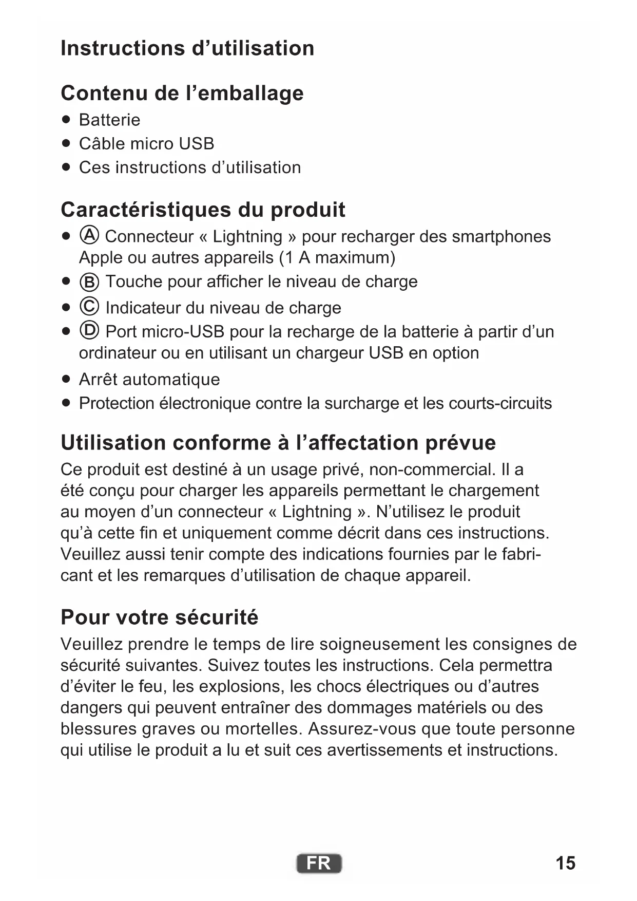 Protection électronique contre la surcharge et les courts-circuits Utilisation conforme à l’affectation prévue Ce produit est destiné à un usage privé, non-commercial. Il a été conçu pour charger les appareils permettant le chargement au moyen d’un connecteur « Lightning ». N’utilisez le produit qu’à cette n et uniquement comme décrit dans ces instructions. Veuillez aussi tenir compte des indications fournies par le fabri- cant et les remarques d’utilisation de chaque appareil. Pour votre sécurité Veuillez prendre le temps de lire soigneusement les consignes de sécurité suivantes. Suivez toutes les instructions. Cela permettra d’éviter le feu, les explosions, les chocs électriques ou d’autres dangers qui peuvent entraîner des dommages matériels ou des blessures graves ou mortelles. Assurez-vous que toute personne qui utilise le produit a lu et suit ces avertissements et instructions.16