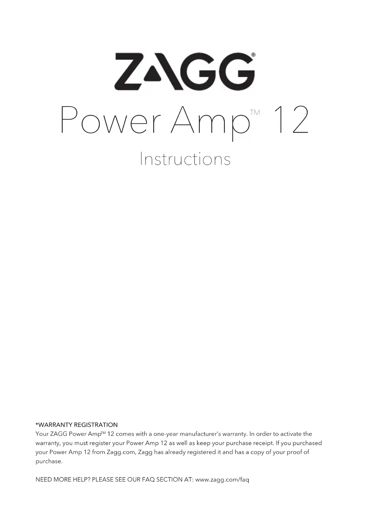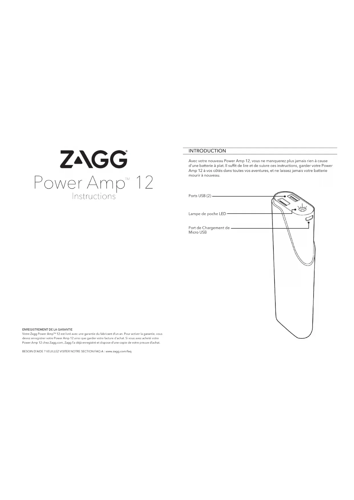 Instructions ENREGISTREMENT DE LA GARANTIEVotre Zagg Power Amp 12 est livré avec une garantie du fabricant d’un an. Pour activer la garantie, vous devez enregistrer votre Power Amp 12 ainsi que garder votre facture d’achat. Si vous avez acheté votre Power Amp 12 chez Zagg.com, Zagg l’a déjà enregistré et dispose d’une copie de votre preuve d’achat. BESOIN D’AIDE ? VEUILLEZ VISITER NOTRE SECTION FAQ A : www.zagg.com/faq INTRODUCTION Avec votre nouveau Power Amp 12, vous ne manquerez plus jamais rien à cause d’une batterie à plat. Il suffit de lire et de suivre ces instructions, garder votre Power Amp 12 à vos côtés dans toutes vos aventures, et ne laissez jamais votre batterie mourir à nouveau. Ports USB (2) Port de Chargement de Micro USB Lampe de poche LEDUTILISATION DE LA LAMPE DE POCHE Votre Power Amp 12 a une lampe de poche LED lumineuse qui est idéale pour éclairer toute situation. Pour profiter de la fonction de lampe de poche :