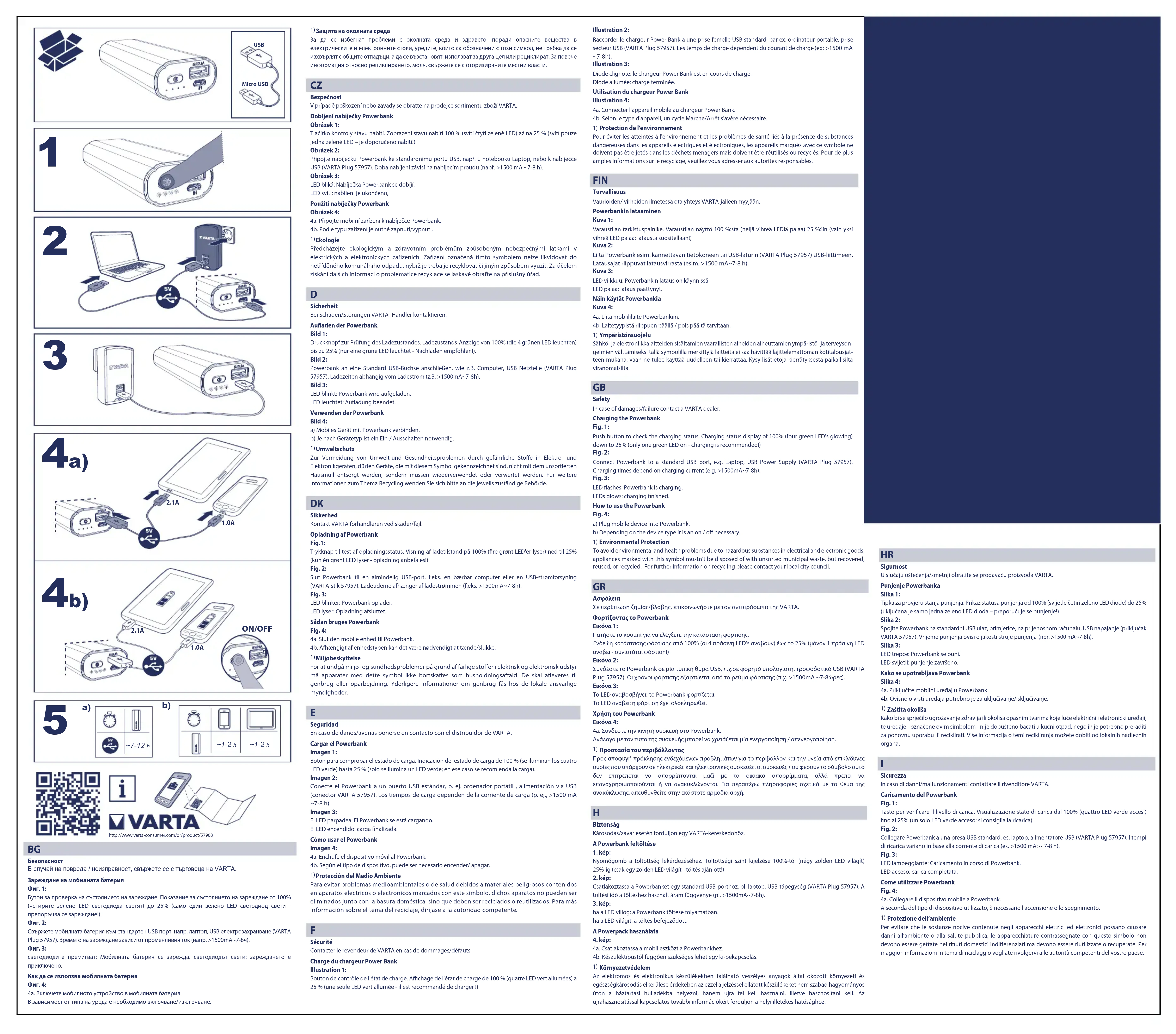Sécurité Contacter le revendeur de VARTA en cas de dommages/défauts. Charge du chargeur Power Bank Illustration 1: Bouton de contrôle de l'état de charge. Affichage de l'état de charge de 100 % (quatre LED vert allumées) à 25 % (une seule LED vert allumée - il est recommandé de charger !) Illustration 2: Raccorder le chargeur Power Bank à une prise femelle USB standard, par ex. ordinateur portable, prise secteur USB (VARTA Plug 57957). Les temps de charge dépendent du courant de charge (ex: >1500 mA ~7-8h). Illustration 3: Diode clignote: le chargeur Power Bank est en cours de charge. Diode allumée: charge terminée. Utilisation du chargeur Power Bank Illustration 4: 4a. Connecter l'appareil mobile au chargeur Power Bank. 4b. Selon le type d'appareil, un cycle Marche/Arrêt s'avère nécessaire.