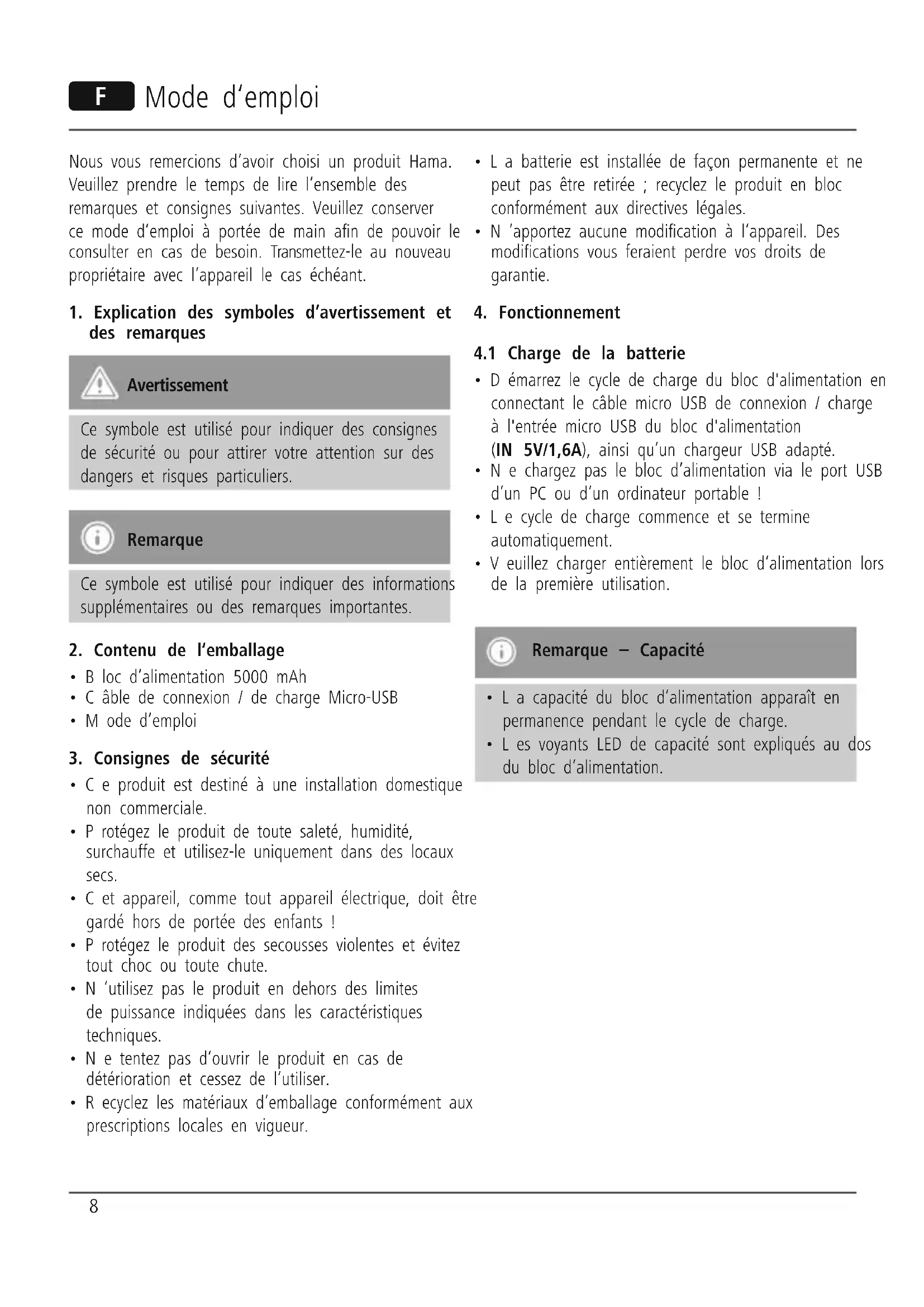 - Veuillez charger entièrement le bloc d‘alimentation lors de la première utilisation. Remarque – Capacité
