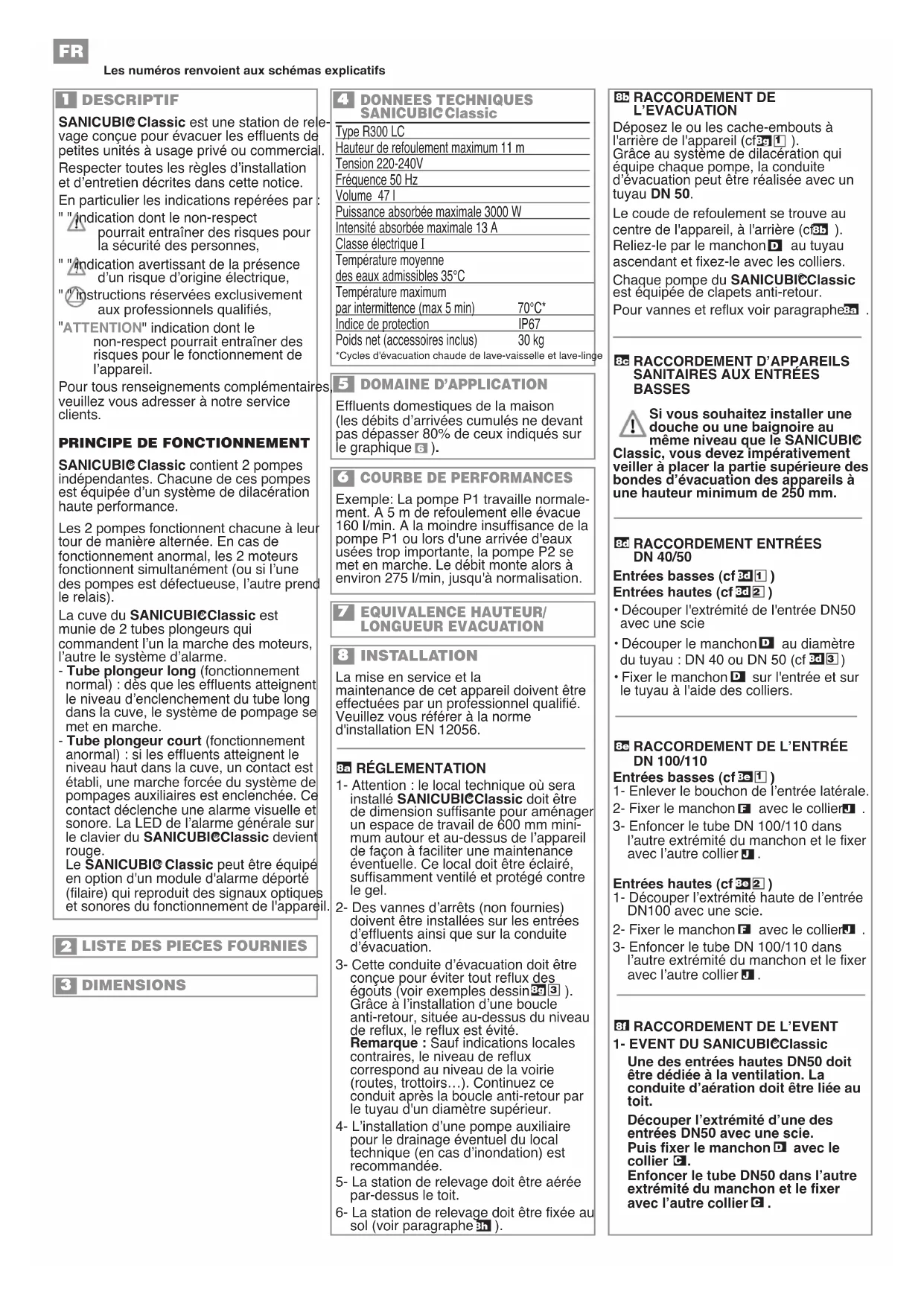 Classic est une station de rele- vage conçue pour évacuer les effluents de petites unités à usage privé ou commercial. Respecter toutes les règles dʼinstallation et dʼentretien décrites dans cette notice. En particulier les indications repérées par : " " indication dont le non-respect pourrait entraîner des risques pour la sécurité des personnes, " " indication avertissant de la présence dʼun risque dʼorigine électrique, " " instructions réservées exclusivement aux professionnels qualifiés,