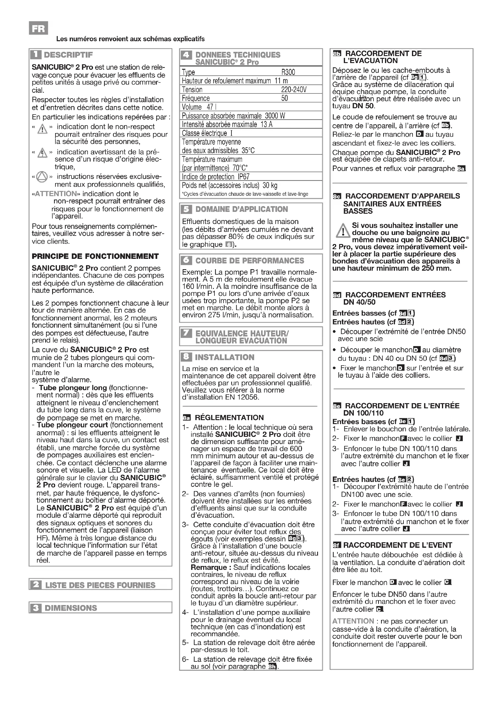2 Pro est conforme à la norme EN 12050-1 (station de relevage pour effluents contenant des matières fécales) ainsi qu’aux directives Européennes sur les produits de construction, la sécurité électrique et la compatibilité électromagnétique.1 DESCRIPTION The SANICUBIC