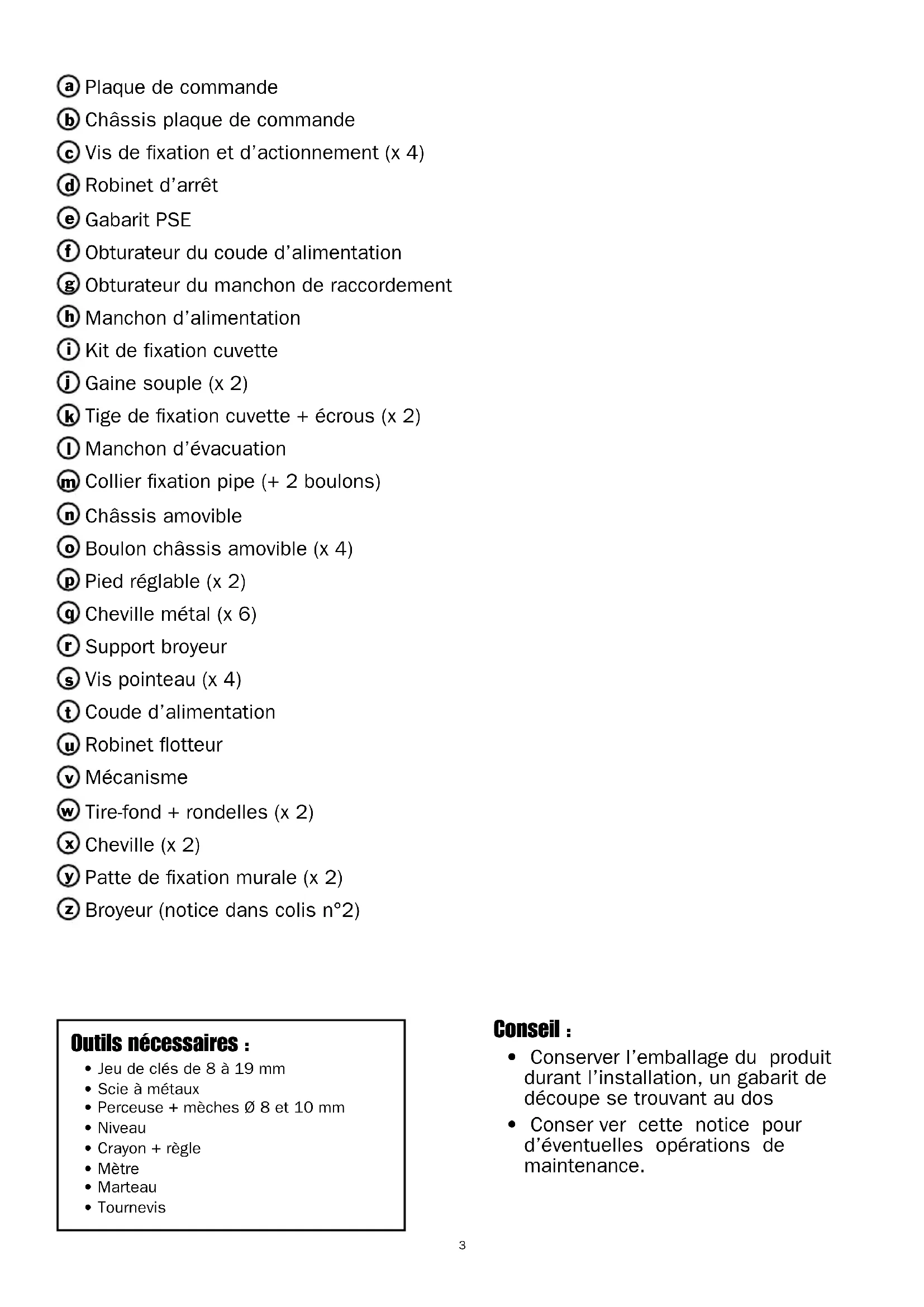 - Conser ver cette notice pour d’éventuelles opérations de maintenance. Plaque de commande Châssis plaque de commande Vis de fixation et d’actionnement (x 4) Robinet d’arrêt Gabarit PSE Obturateur du coude d’alimentation Obturateur du manchon de raccordement Manchon d’alimentation Kit de fixation cuvette Gaine souple (x 2) Tige de fixation cuvette + écrous (x 2) Manchon d’évacuation Collier fixation pipe (+ 2 boulons) Châssis amovible Boulon châssis amovible (x 4) Pied réglable (x 2) Cheville métal (x 6) Support broyeur Vis pointeau (x 4) Coude d’alimentation Robinet flotteur Mécanisme Tire-fond + rondelles (x 2) Cheville (x 2) Patte de fixation murale (x 2) Broyeur (notice dans colis n°2)