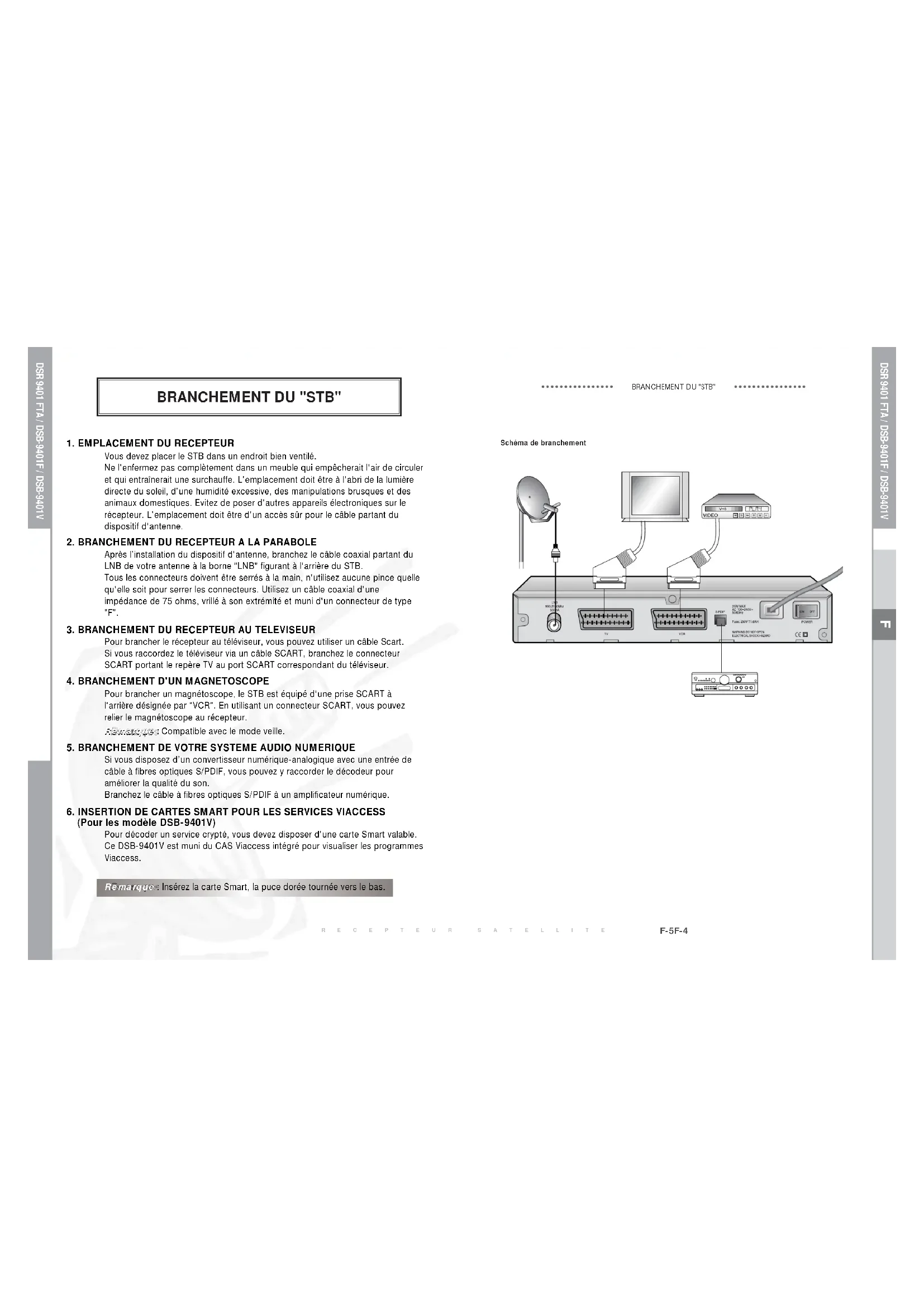 F-1 Ce STB a été fabriqué conformément aux normes de sécurité internationales. Veuillez lire attentivement les recommandations de sécurité suivantes. ALIMENTATION SECTEUR : AC 100~240V 50/60Hz SURCHARGE : Evitez de surcharger les prises murales, les rallonges ou les adaptateurs, car il peut s'ensuivre un incendie ou une électrocution. LIQUIDES : Tenez les liquides à l'écart du STB NETTOYAGE : Avant de le nettoyer, déconnectez le STB de la prise murale. Utilisez un chiffon doux légèrement humecté d'eau (pas de solvants) pour nettoyer l'extérieur. AERATION : N'obstruez pas les orifices d'aération du STB. Vérifiez que la circulation d'air peut s'effectuer librement autour du STB. Ne placez jamais le STB dans un endroit exposé à la lumière directe du soleil ou à proximité d'une source de chaleur, un radiateur par exemple. N'empilez aucun autre appareil électronique sur le STB. Placez le STB au minimum à 30 mm du mur. FIXATIONS : N'utilisez aucune fixation non recommandée par le fabricant du produit, car elles peuvent comporter des risques et endommager l'appareil. BRANCHEMENT AU LNB DE LA PARABOLE SATELLITE : L’âme du câble de connexion du LNB présente une tension élevée. Il est donc recommandé de débrancher le STB de l'alimentation secteur avant de brancher ou de débrancher ce câble. DANS LE CAS CONTRAIRE, LE LNB RISQUE D'ETRE ENDOMMAGE. REPARATIONS : Ne tentez pas de réparer vous-même cet appareil. Toute tentative dans ce sens entraîne une annulation de la garantie. Confiez l'ensemble des réparations à un agent qualifié. FOUDRE : Si le STB est installé dans une zone à forte activité orageuse, il est indispensable de mettre en place des dispositifs de protection pour le branchement du STB au secteur ainsi que pour la ligne du téléphone et du modem. En cas d'orage, vous devez également respecter les consignes de chaque fabricant visant à protéger les autres appareils, tels le téléviseur, la chaîne hi-fi, etc., reliés au STB. MISE A LA TERRE : La masse du câble du LNB doit est reliée directement à la prise de masse du système de la parabole. L'installation de mise à la terre doit être conforme aux réglementations locales. RRRReeeemmmmaaaarrrrqqqquuuuee ee : Jetez les batteries usagées dans un lieu prévu à cet effet de manière à protéger l'environnement. DSR 9401_FRA_5.0 5/22/03 6:19 PM Page IVDSR 9401 FTA / DSB-9401F / DSB-9401V SOMMAIRE