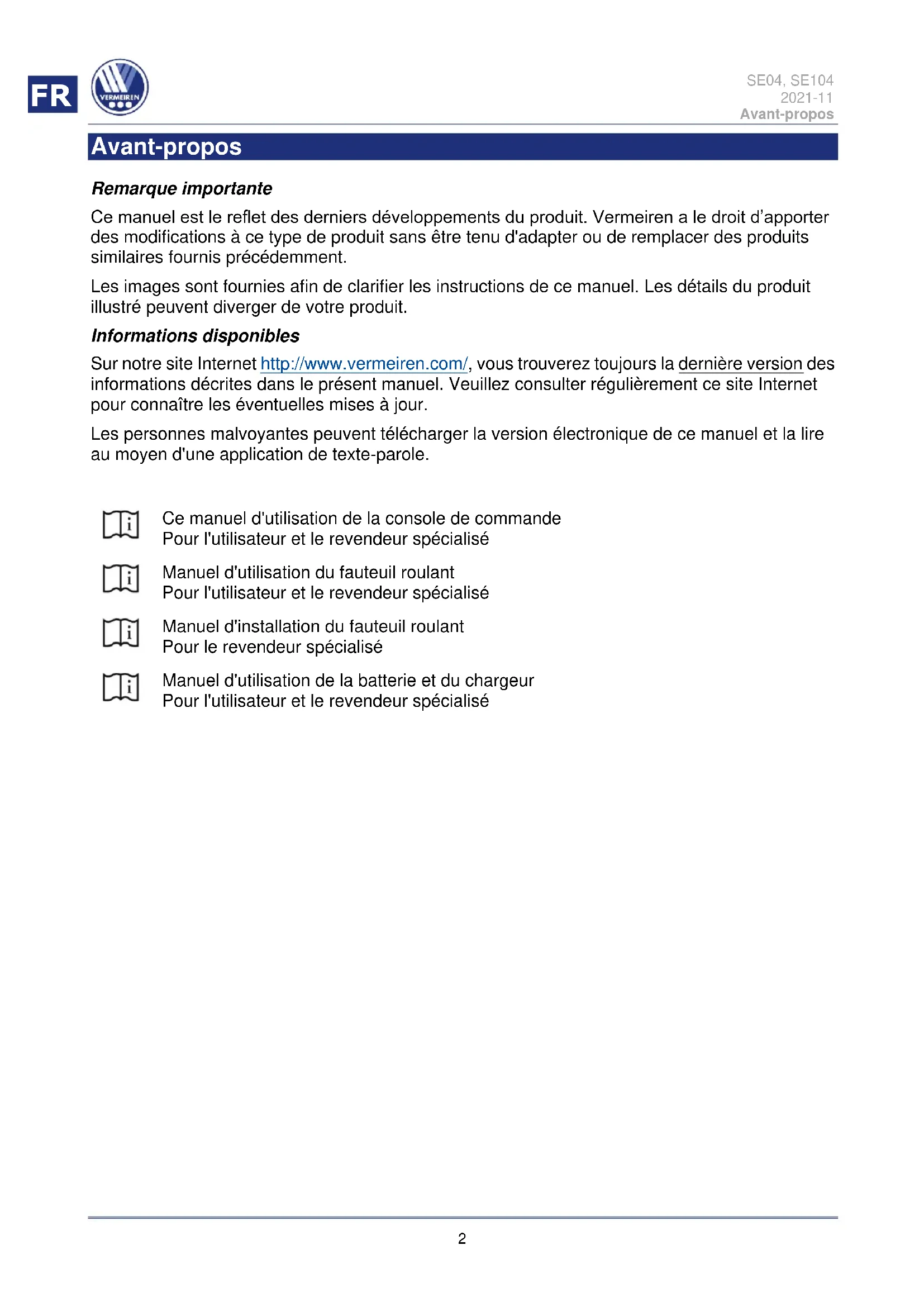 Avant-propos Remarque importante Ce manuel est le reflet des derniers développements du produit. Vermeiren a le droit d’apporter des modifications à ce type de produit sans être tenu d'adapter ou de remplacer des produits similaires fournis précédemment. Les images sont fournies afin de clarifier les instructions de ce manuel. Les détails du produit illustré peuvent diverger de votre produit. Informations disponibles Sur notre site Internet http://www.vermeiren.com/, vous trouverez toujours la dernière version des informations décrites dans le présent manuel. Veuillez consulter régulièrement ce site Internet pour connaître les éventuelles mises à jour. Les personnes malvoyantes peuvent télécharger la version électronique de ce manuel et la lire au moyen d'une application de texte-parole.