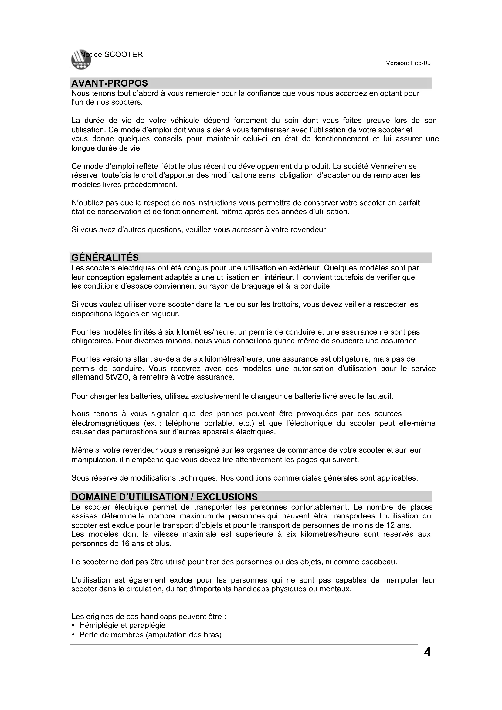 Tous droits, également ceux de la traduction, réservés. Aucune partie de ce mode d’emploi ne peut être reproduite sous quelque forme que ce soit (impression, photocopie, microfilm ou autre procédé) sans l’autorisation écrite de l’éditeur ou traitée, reproduite ou diffusée à l’aide de systèmes électroniques. Vermeiren Belgique, 2008Notice SCOOTER Version: Feb-09