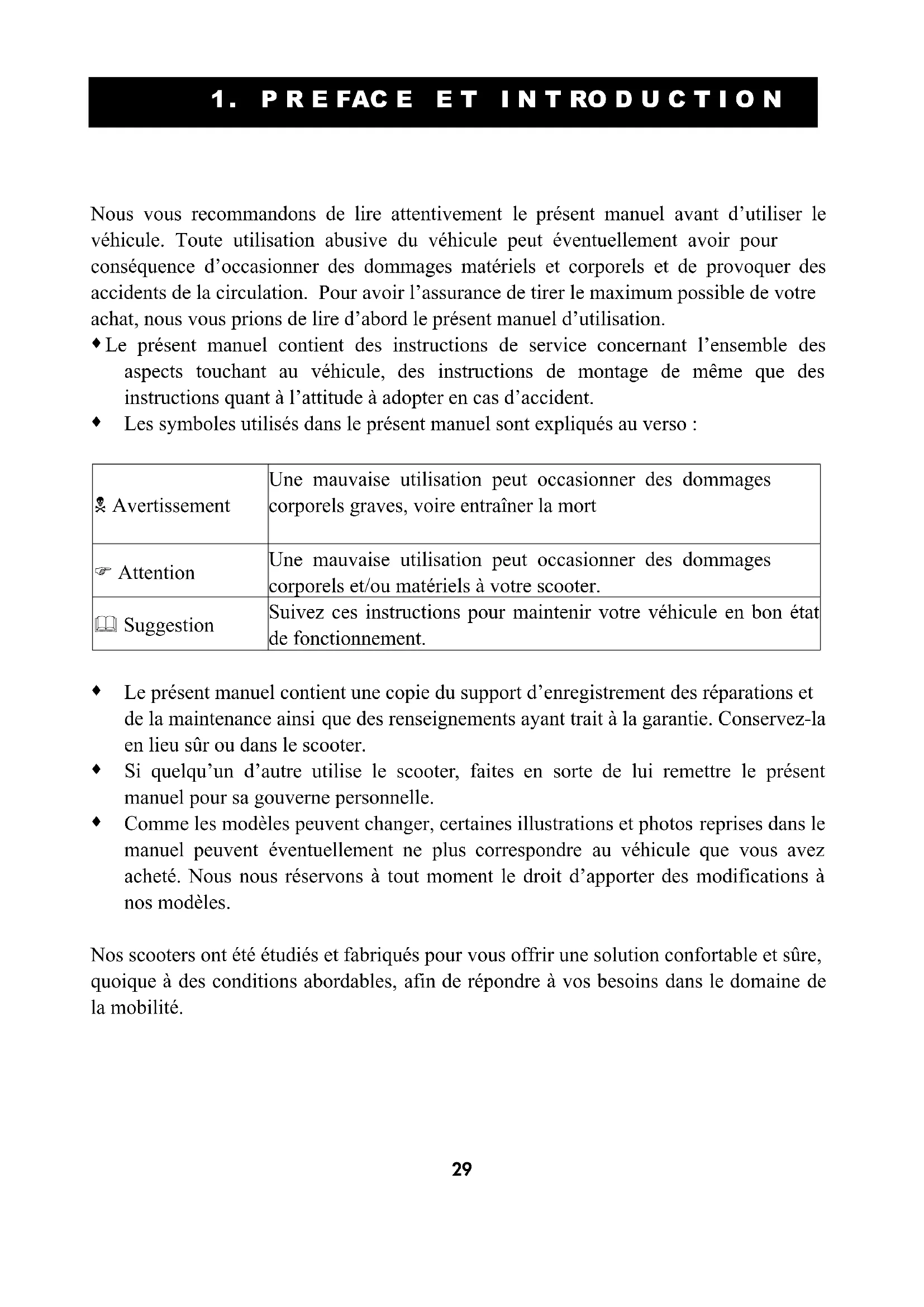 Nous vous recommandons de lire attentivement le présent manuel avant d’utiliser le véhicule. Toute utilisation abusive du véhicule peut éventuellement avoir pour conséquence d’occasionner des dommages matériels et corporels et de provoquer des accidents de la circulation. Pour avoir l’assurance de tirer le maximum possible de votre achat, nous vous prions de lire d’abord le présent manuel d’utilisation.