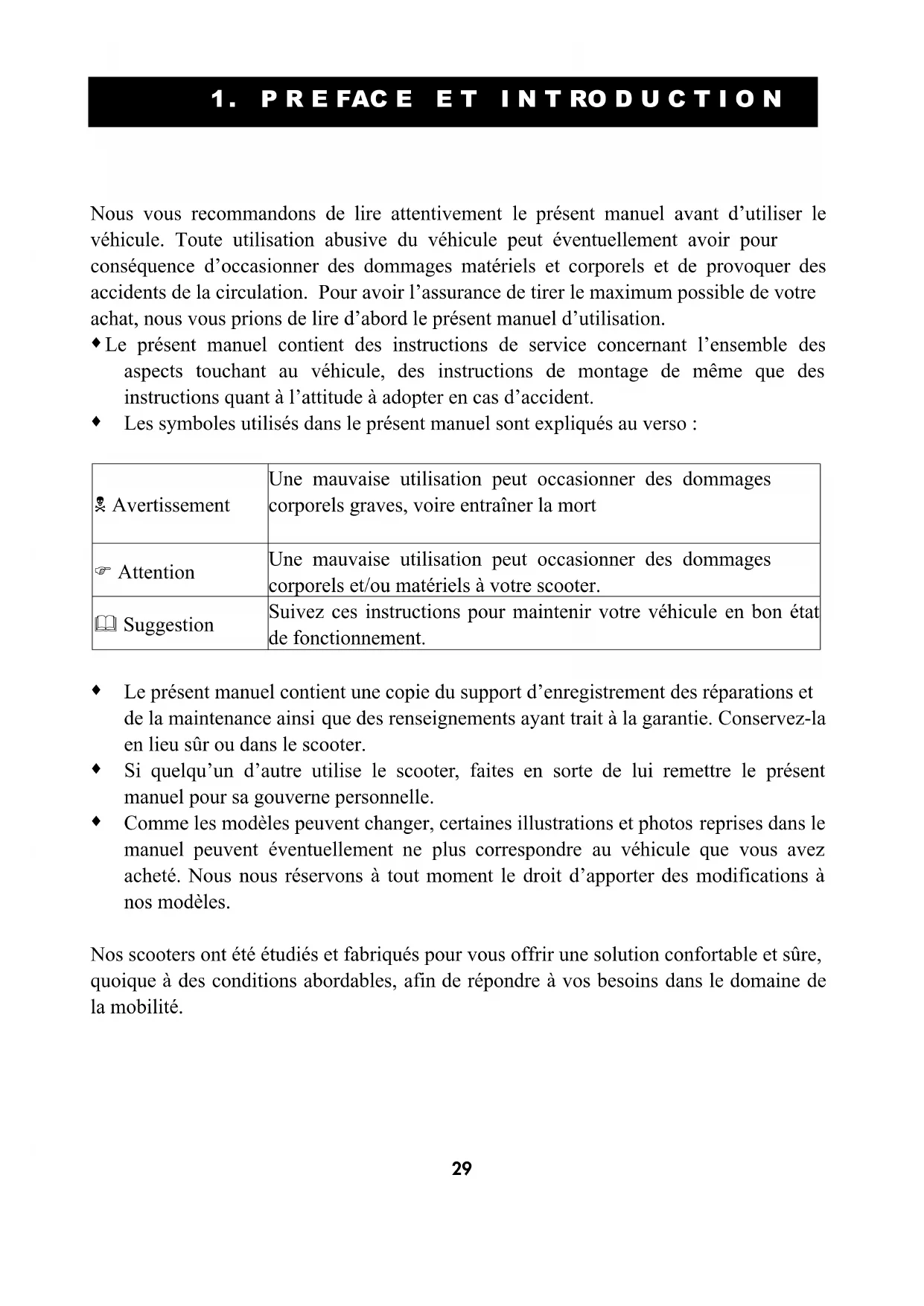 Nous vous recommandons de lire attentivement le présent manuel avant d’utiliser le véhicule. Toute utilisation abusive du véhicule peut éventuellement avoir pour conséquence d’occasionner des dommages matériels et corporels et de provoquer des accidents de la circulation. Pour avoir l’assurance de tirer le maximum possible de votre achat, nous vous prions de lire d’abord le présent manuel d’utilisation.