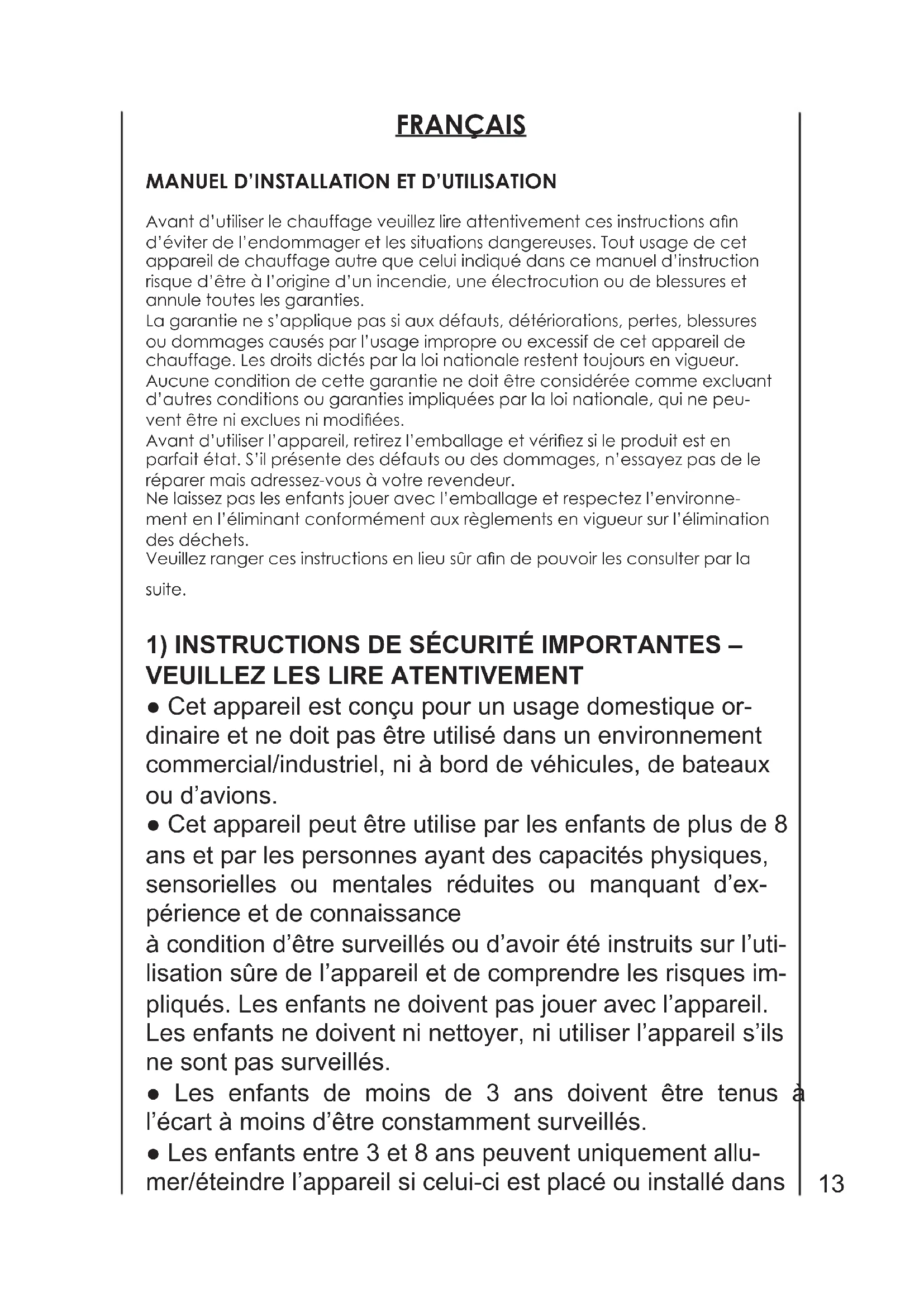 Avant d'utiliser le chauffage veuillez lire attentivement ces instructions afin d'éviter de l'endommager et les situations dangereuses. Tout usage de cet appareil de chauffage autre que celui indiqué dans ce manuel d'instruction risque d'être à l'origine d'un incendie, une électrocution ou de blessures et annule toutes les garanties.