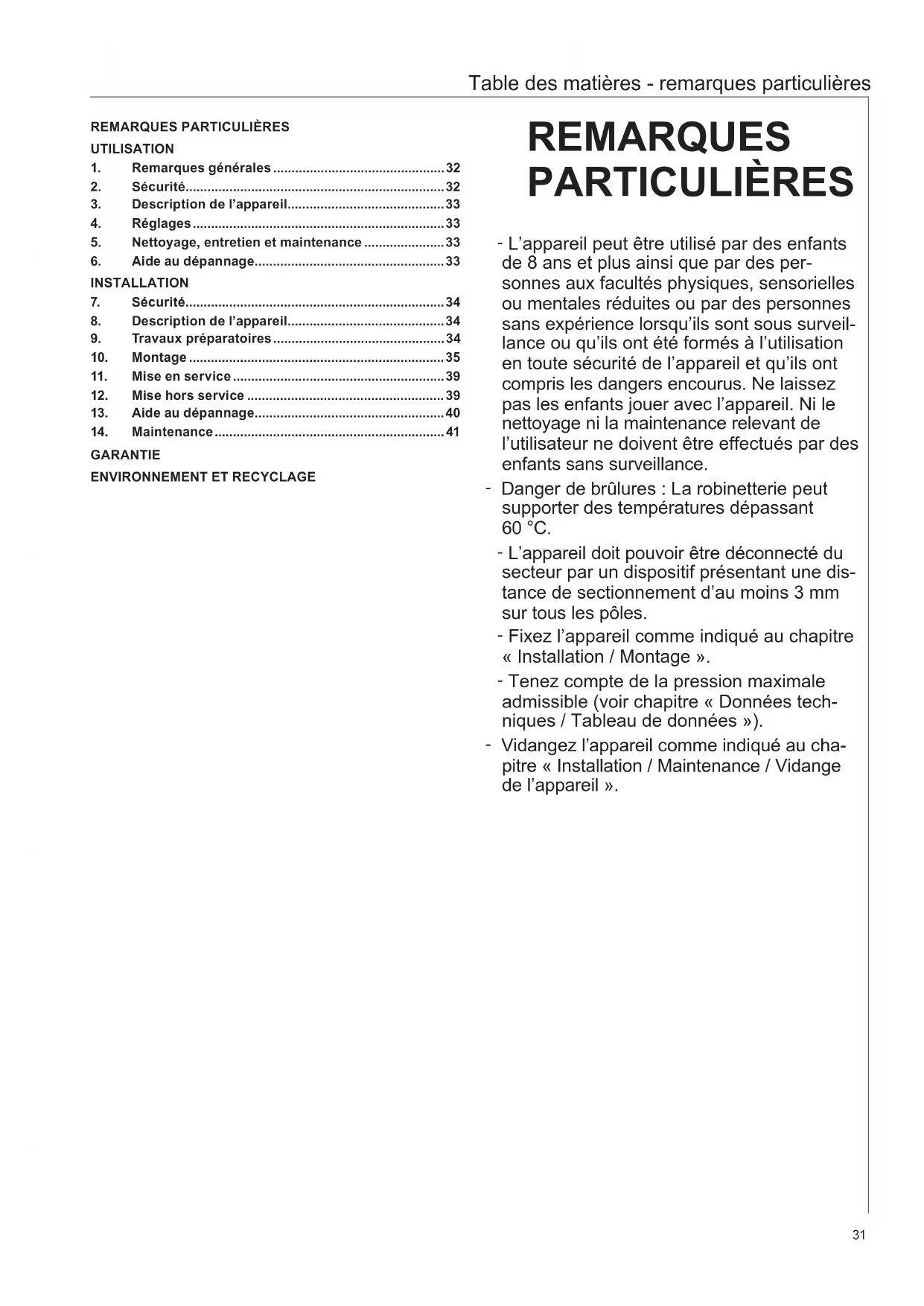 Les chapitres « Remarques particulières » et « Utilisation » s'adressent aux utilisateurs de l'appareil et aux installateurs.