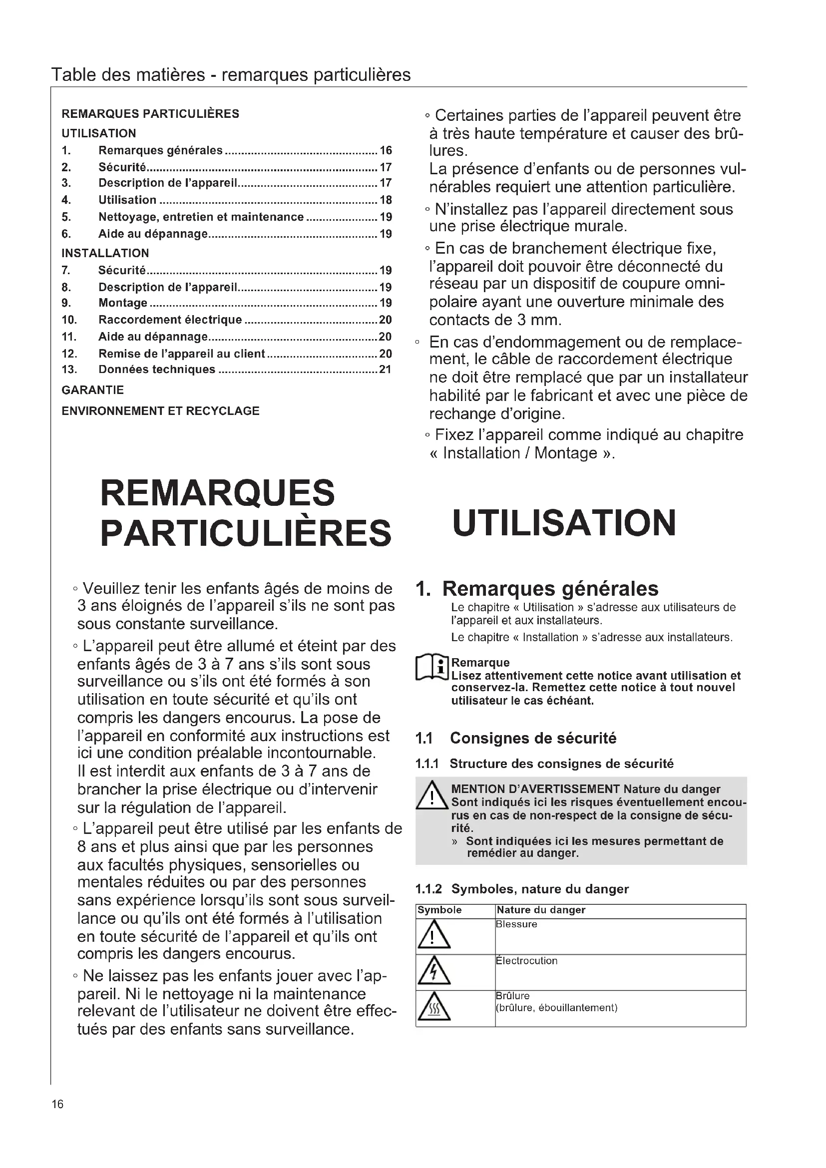 AVERTISSEMENT BlessureVeuillez tenir les enfants âgés de moins de 3 ans éloi-gnés de l’appareil s’ils ne sont pas sous constante surveillance.L’appareil peut être allumé et éteint par des enfants âgés de 3 à 7 ans s’ils sont sous surveillance ou s’ils ont été formés à son utilisation en toute sécu-rité et qu’ils ont compris les dangers encourus. La pose de l’appareil en conformité aux instructions est ici une condition préalable incontournable. Il est interdit aux enfants de 3 à 7 ans de brancher la prise électrique ou d’intervenir sur la régulation de l’appareil.L’appareil peut être utilisé par les enfants de 8 ans et plus ainsi que par les personnes aux facultés phy-siques, sensorielles ou mentales réduites ou par des personnes sans expérience lorsqu’ils sont sous sur-veillance ou qu’ils ont été formés à l’utilisation en toute sécurité de l’appareil et qu’ils ont compris les dangers encourus.Ne laissez pas les enfants jouer avec l’appareil. Ni le nettoyage ni la maintenance relevant de l’utilisa-teur ne doivent être effectués par des enfants sans surveillance. ATTENTION BrûlureCertaines parties de l’appareil peuvent être à très haute température et causer des brûlures. La pré-sence d’enfants ou de personnes vulnérables re-quiert une attention particulière. RemarqueN’utilisez cet appareil que lorsqu’il est complètement installé et doté de tous les dispositifs de sécurité.