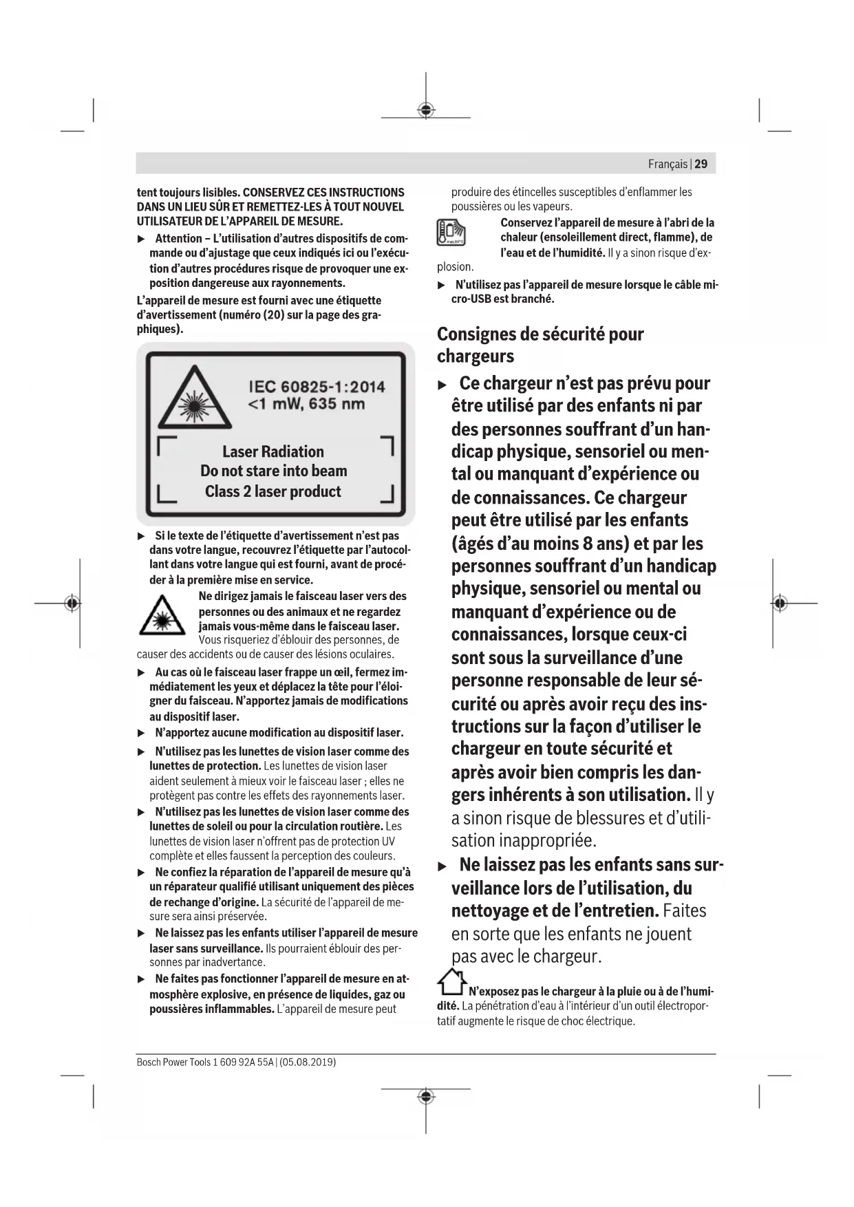 et le troisième appui la hauteur de la pièce A. Addition de valeurs de mesure Pour additionner des valeurs de mesure, effectuez une pre- mière mesure ou sélectionnez une valeur dans la liste des va- leurs mesurées. Appuyez ensuite sur la touche Plus (11). Sur l’écran apparaît «+» en guise de confirmation. Effectuez ensuite une deuxième mesure ou sélectionnez une autre va- leur dans la liste des valeurs mesurées. Pour lire la somme des deux mesures, appuyez sur la touche Résultat (6). Le calcul est affiché sur les lignes de valeurs mesurées (a), la somme apparaît sur la ligne de résultat (c). Une fois la somme calculée, d’autres valeurs mesurées ou va- leurs de la liste des valeurs mesurées peuvent être addition- nées à ce résultat, à condition d’appuyer sur la touche Plus (11) avant d’effectuer la mesure. Pour mettre fin à l’addition de valeurs, appuyez sur la touche Résultat (6). Remarques pour l’addition de valeurs: – Il n’est pas possible d’additionner conjointement des va- leurs de distances, de surfaces et de volumes. Si vous es- sayez p. ex. d’additionner une valeur de distance et une valeur de surface, il apparaît brièvement sur l’écran «ER- ROR» lorsque vous appuyez sur la touche Résultat (6). L’appareil de mesure repasse ensuite dans le mode de mesure actif en dernier. – C’est toujours le résultat d’une mesure (p. ex. valeur de volume) qui est additionné; pour les mesures continues, c’est la valeur mesurée affichée sur la ligne de résultat (c). Il n’est pas possible d’additionner les valeurs des lignes de valeurs mesurées (a). Soustraction de valeurs de mesure Pour soustraire des valeurs de mesure, ap- puyez sur la touche Moins (5); sur l’écran ap- paraît «–» en guise de confirmation. Le reste 1 609 92A 55A | (05.08.2019) Bosch Power ToolsFrançais | 37 de la procédure est similaire à l’«Addition de valeurs de me- sure». Instructions d’utilisation Indications générales La lentille de réception (17), l’orifice de sortie du faisceau la- ser (16) ne doivent pas être recouverts lors d’une mesure. L’appareil de mesure ne doit pas être déplacé pendant une mesure (sauf dans les modes Mesure continue et Mesure d’inclinaison). Posez-le pour cette raison sur une surface stable ou appuyez-le contre un rebord. Facteurs influant sur la portée La portée dépend des conditions de luminosité et des pro- priétés de réflexion de la surface cible. Pour améliorer la visi- bilité du faisceau laser lors des travaux à l’extérieur en cas d’un fort ensoleillement, utilisez les lunettes de vision laser (28) (accessoire) et la cible (29) (accessoire) ou faites en sorte que la surface cible se trouve à l’ombre. Facteurs influant sur les résultats de mesure En raison de phénomènes physiques, il n’est pas exclu que les mesures effectuées sur des certaines surfaces donnent des résultats erronés. Ci-dessous les surfaces concernées: – Surfaces transparentes (telles que verre, eau), – Surfaces réfléchissantes (telles que métal poli, verre), – Surfaces poreuses (telles que matériaux isolants), – Surfaces avec relief (telles que crépi, pierre naturelle). Pour ces surfaces, utilisez éventuellement la cible laser (29) (accessoire). Des erreurs de mesure sont également possibles lorsque le faisceau laser frappe de biais la surface visée. Des couches d’air de températures différentes ou les ré- flexions indirectes peuvent également influencer la valeur de mesure. Contrôle de précision et calibrage des mesures d’inclinaison (voir figureH) Vérifiez à intervalles réguliers la précision des mesures d’in- clinaison. Pour cela, procédez à une mesure d’inversion. À cet effet, placez l’appareil de mesure sur une table et mesu- rez l’inclinaison. Tournez l’appareil de mesure de 180° et mesurez à nouveau l’inclinaison. La différence entre les va- leurs affichées ne doit pas dépasser 0,3°. En cas d’écart plus important, calibrez à nouveau l’appareil de mesure. A cet effet, maintenez appuyée la touche Mesure d’inclinaison (3). Suivez les indications apparaissant sur l’écran. Contrôle de la précision des mesures de distance La précision de mesure de l’appareil de mesure peut être vé- rifiée de la manière suivante: – Choisissez une distance à mesurer fixe, comprise entre 1m et 10m, dont vous connaissez la valeur (parex. lar- geur d’une pièce, largeur d’une embrasure de porte). La distance à mesurer doit se situer à l’intérieur de la pièce, la cible doit être lisse et bien réfléchissante. – Mesurez cette distance 10 fois de suite. L’écart entre les différentes valeurs obtenues ne doit s’écar- ter de plus de ±2mm de la valeur moyenne. Consignez par écrit les valeurs mesurées pour pouvoir effectuer ultérieure- ment des mesures de précision comparatives. Utilisation avec un trépied (accessoire) L’utilisation d’un trépied est surtout nécessaire pour les grandes distances. Fixez l’appareil de mesure avec son rac- cord de trépied 1/4" (19) sur le plateau à changement ra- pide du trépied (27) ou un trépied d’appareil photo du com- merce. Vissez-le au moyen de la vis de blocage du plateau à changement rapide. Réglez le plan de référence pour les mesures avec trépied au moyen de la touche (10) (plan de référence orifice taraudé). Utilisation du rail de mesure (voir figuresI–K) Le rail de mesure (25) permet d’effectuer des mesures d’in- clinaison d’une plus grande précision. Le rail de mesure ne permet pas d’effectuer des mesures de distance. Insérez l’appareil de mesure dans le rail de me- sure (25) conformément aux indications de la figure et verrouillez l’appareil de mesure à l’aide du levier de verrouillage (26). Appuyez sur la touche Mesure (2) pour activer le mode «Rail de mesure». Vérifiez à intervalles réguliers la précision des mesures d’in- clinaison e