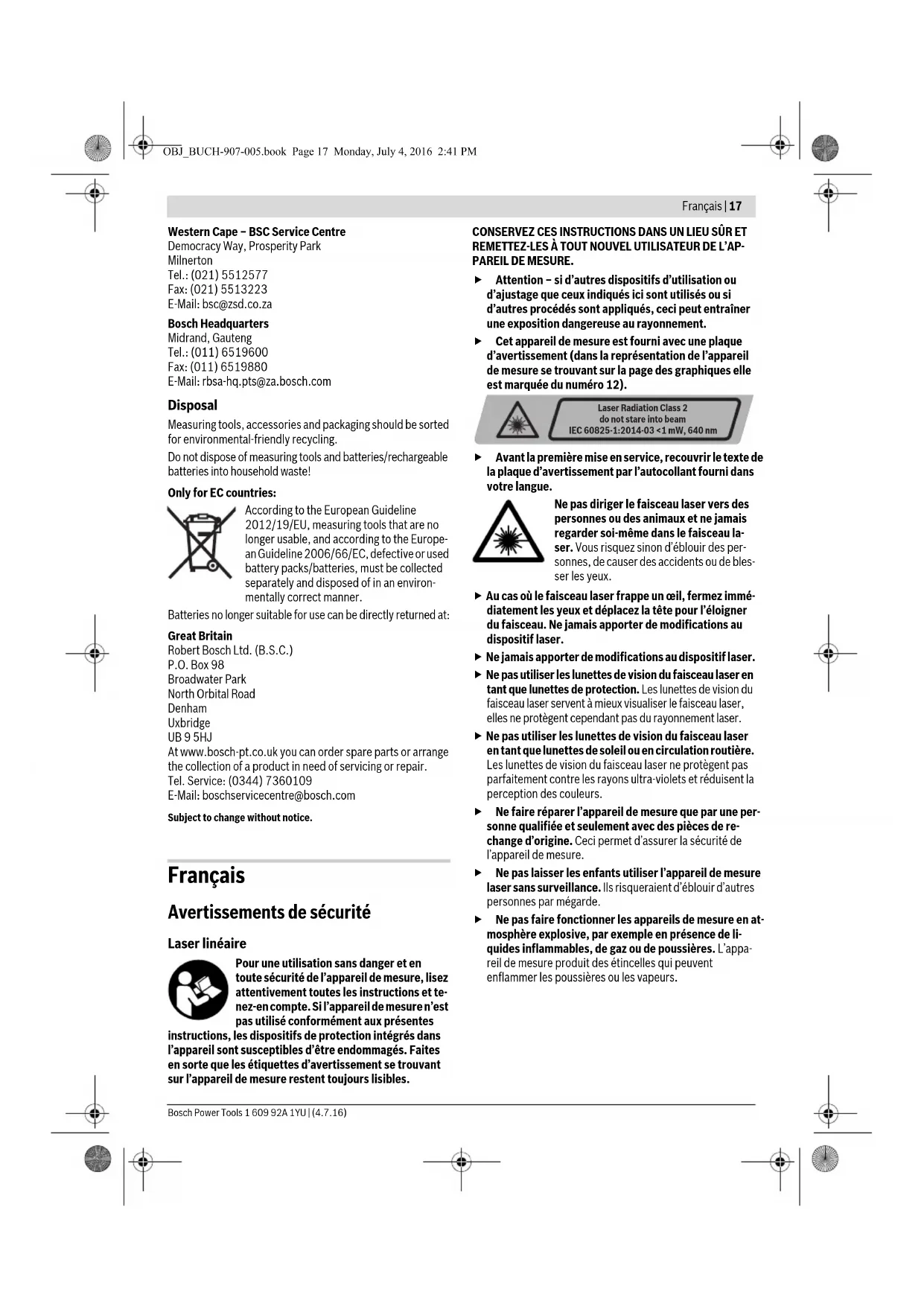 OBJ_BUCH-907-005.book Page 15 Monday, July 4, 2016 2:41 PM16 | English 1 609 92A 1YU | (4.7.16) Bosch Power Tools Working with the Measuring Plate (Accessory) (seefiguresA–B) With the measuring plate 16, it is possible to project the laser mark onto the floor or the laser height onto a wall. With the zero field and the scale, the offset or drop to the re- quired height can be measured and projected at another loca- tion. This eliminates the necessity of precisely adjusting the measuring tool to the height to be projected. The measuring plate 16 has a reflective coating that enhances the visibility of the laser beam at greater distances or in intense sunlight. The brightness intensification can be seen only when viewing, parallel to the laser beam, onto the measuring plate. Working with the Laser Receiver (Accessory) (see figure D) Under unfavourable light conditions (bright environment, di- rect sunlight) and for larger distances, use the laser receiver for improved finding of the laser lines 17. When working with the laser receiver, switch the pulse function on (see “Pulse Function”, page 13). Laser Viewing Glasses (Accessory) The laser viewing glasses filter out the ambient light. This makes the red light of the laser appear brighter for the eyes. Do not use the laser viewing glasses as safety goggles. The laser viewing glasses are used for improved visualisa- tion of the laser beam, but they do not protect against laser radiation. Do not use the laser viewing glasses as sun glasses or in traffic. The laser viewing glasses do not afford complete UV protection and reduce colour perception. Work Examples (see figures C–H) Applicational examples for the measuring tool can be found on the graphics pages. Maintenance and Service Maintenance and Cleaning Store and transport the measuring tool only in the supplied protective pouch. Keep the measuring tool clean at all times. Do not immerse the measuring tool in water or other fluids. Wipe off debris using a moist and soft cloth. Do not use any cleaning agents or solvents. Regularly clean the surfaces at the exit opening of the laser in particular, and pay attention to any fluff or fibres. In case of repairs, send in the measuring tool packed in its protective pouch 18. After-sales Service and Application Service Our after-sales service responds to your questions concern- ing maintenance and repair of your product as well as spare parts. Exploded views and information on spare parts can al- so be found under: www.bosch-pt.com Bosch’s application service team will gladly answer questions concerning our products and their accessories. In all correspondence and spare parts orders, please always include the 10-digit article number given on the nameplate of the product. Great Britain Robert Bosch Ltd. (B.S.C.) P.O. Box 98 Broadwater Park North Orbital Road Denham Uxbridge UB 9 5HJ At www.bosch-pt.co.uk you can order spare parts or arrange the collection of a product in need of servicing or repair. Tel. Service: (0344) 7360109 E-Mail: boschservicecentre@bosch.com Ireland Origo Ltd. Unit 23 Magna Drive Magna Business Park City West Dublin 24 Tel. Service: (01) 4666700 Fax: (01) 4666888 Australia, New Zealand and Pacific Islands Robert Bosch Australia Pty. Ltd. Power Tools Locked Bag 66 Clayton South VIC 3169 Customer Contact Center Inside Australia: Phone: (01300) 307044 Fax: (01300) 307045 Inside New Zealand: Phone: (0800) 543353 Fax: (0800) 428570 Outside AU and NZ: Phone: +61 3 95415555 www.bosch.com.au Republic of South Africa Customer service Hotline: (011) 6519600 Gauteng – BSC Service Centre 35 Roper Street, New Centre Johannesburg Tel.: (011) 4939375 Fax: (011) 4930126 E-Mail: bsctools@icon.co.za KZN – BSC Service Centre Unit E, Almar Centre 143 Crompton Street Pinetown Tel.: (031) 7012120 Fax: (031) 7012446 E-Mail: bsc.dur@za.bosch.com OBJ_BUCH-907-005.book Page 16 Monday, July 4, 2016 2:41 PMFrançais | 17 Bosch Power Tools 1 609 92A 1YU | (4.7.16) Western Cape – BSC Service Centre Democracy Way, Prosperity Park Milnerton Tel.: (021) 5512577 Fax: (021) 5513223 E-Mail: bsc@zsd.co.za Bosch Headquarters Midrand, Gauteng Tel.: (011) 6519600 Fax: (011) 6519880 E-Mail: rbsa-hq.pts@za.bosch.com Disposal Measuring tools, accessories and packaging should be sorted for environmental-friendly recycling. Do not dispose of measuring tools and batteries/rechargeable batteries into household waste! Only for EC countries: According to the European Guideline 2012/19/EU, measuring tools that are no longer usable, and according to the Europe- an Guideline 2006/66/EC, defective or used battery packs/batteries, must be collected separately and disposed of in an environ- mentally correct manner. Batteries no longer suitable for use can be directly returned at: Great Britain Robert Bosch Ltd. (B.S.C.) P.O. Box 98 Broadwater Park North Orbital Road Denham Uxbridge UB 9 5HJ At www.bosch-pt.co.uk you can order spare parts or arrange the collection of a product in need of servicing or repair. Tel. Service: (0344) 7360109 E-Mail: boschservicecentre@bosch.com Subject to change without notice. Français Avertissements de sécurité Laser linéaire Pour une utilisation sans danger et en toute sécurité de l’appareil de mesure, lisez attentivement toutes les instructions et te- nez-en compte. Si l’appareil de mesure n’est pas utilisé conformément aux présentes instructions, les dispositifs de protection intégrés dans l’appareil sont susceptibles d’être endommagés. Faites en sorte que les étiquettes d’avertissement se trouvant sur l’appareil de mesure restent toujours lisibles. CONSERVEZ CES INSTRUCTIONS DANS UN LIEU SÛR ET REMETTEZ-LES À TOUT NOUVEL UTILISATEUR DE L’AP- PAREIL DE MESURE. Attention – si d’autres dispositifs d’utilisation ou d’ajustage que ceux indiqués ici sont utilisés ou si d’autres procédés sont appliqués, ceci peut entraîner une exposition dangereuse au rayonnement. Cet appareil de mesure est f
