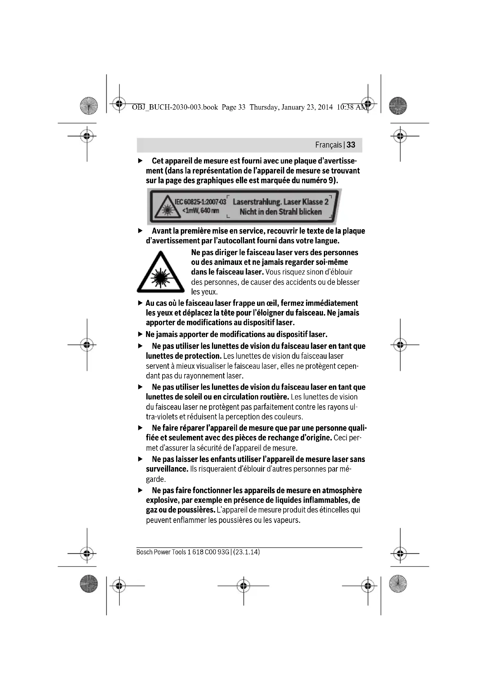 - L’angle d’inclinaison h et les lignes laser ne sont affichées qu’à partir d’une inclinaison >à ±2°. OBJ_BUCH-2030-003.book Page 38 Thursday, January 23, 2014 10:38 AMFrançais | 39 Bosch Power Tools 1 618 C00 93G | (23.1.14) Mode lignes croisées (voir figure D) : L’appareil de me- sure génère deux lignes laser croisées qui peuvent être li- brement orientées et ne sont forcément perpendiculaires l’une par rapport à l’autre. Mode lignes croisées. L’appareil de mesure est incliné vers la gauche.* Mode lignes croisées. L’appareil de mesure est incliné vers la droite.* Niveau à bulle numérique. L’appareil de mesure contrôle l’horizontalité ou la verticalité comme un niveau à bulle. Aucune ligne laser n’est projetée. Niveau à bulle numérique. L’appareil de mesure est incli- né vers la gauche. Le plus petit angle affiché est 0,1 °. Niveau à bulle numérique. L’appareil de mesure est incli- né vers la droite. Le plus petit angle affiché est 0,1 °. L’angle d’inclinaison dépasse ±10 ° vers l’avant (en direc- tion du laser) ou vers l’arrière (en direction de l’écran), l’af- fichage clignote. La ligne laser disparaît. Le calibrage est en cours (l’affichage cli- gnote). Le calibrage est terminé. Affichage Mode
