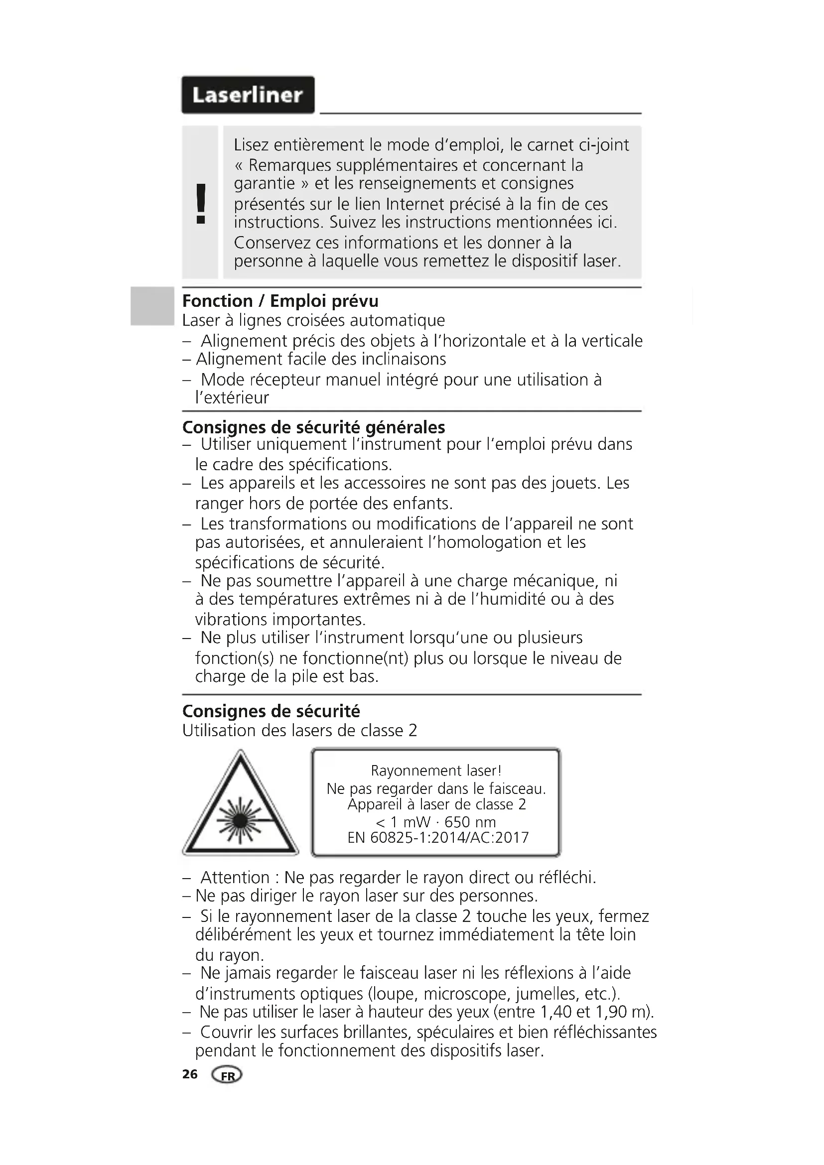 Fonction / Emploi prévu Laser à lignes croisées automatique – Alignement précis des objets à l’horizontale et à la verticale – Alignement facile des inclinaisons – Mode récepteur manuel intégré pour une utilisation à l’extérieur Consignes de sécurité générales – Utiliser uniquement l‘instrument pour l‘emploi prévu dans le cadre des spécications. – Les appareils et les accessoires ne sont pas des jouets. Les ranger hors de portée des enfants. – Les transformations ou modications de l’appareil ne sont pas autorisées, et annuleraient l’homologation et les spécications de sécurité. – Ne pas soumettre l’appareil à une charge mécanique, ni à des températures extrêmes ni à de l’humidité ou à des vibrations importantes. – Ne plus utiliser l‘instrument lorsqu‘une ou plusieurs fonction(s) ne fonctionne(nt) plus ou lorsque le niveau de charge de la pile est bas. Rayonnement laser! Ne pas regarder dans le faisceau. Appareil à laser de classe 2 < 1 mW · 650 nm EN 60825-1:2014/AC:2017 Consignes de sécurité Utilisation des lasers de classe 2 – Attention : Ne pas regarder le rayon direct ou rééchi. – Ne pas diriger le rayon laser sur des personnes. – Si le rayonnement laser de la classe 2 touche les yeux, fermez délibérément les yeux et tournez immédiatement la tête loin du rayon. – Ne jamais regarder le faisceau laser ni les réexions à l’aide d’instruments optiques (loupe, microscope, jumelles, etc.). – Ne pas utiliser le laser à hauteur des yeux (entre 1,40 et 1,90 m). – Couvrir les surfaces brillantes, spéculaires et bien rééchissantes pendant le fonctionnement des dispositifs laser. FRSmartCross-Laser