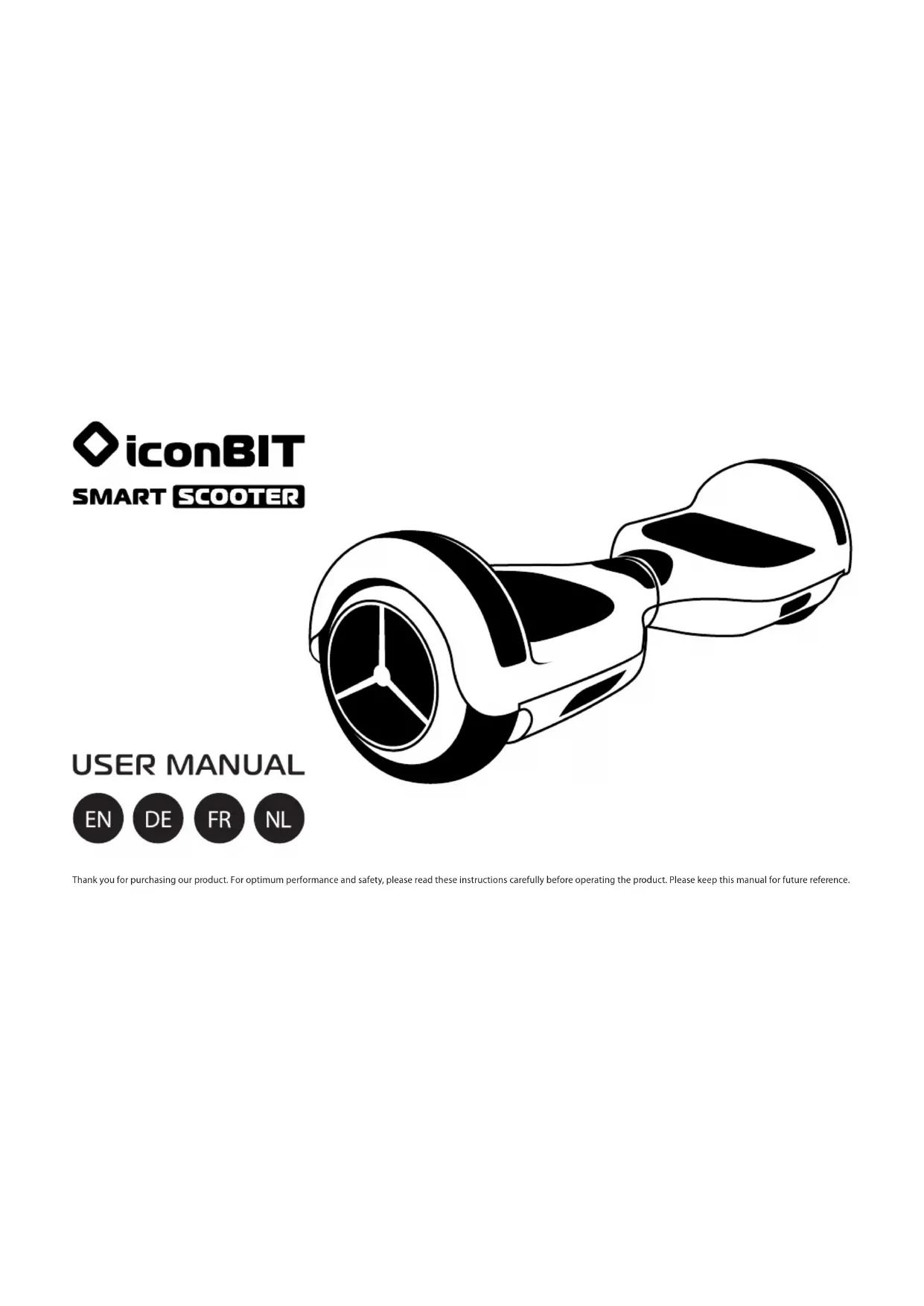 Nous vous remercions de l'achat de votre nouveau scooter ainsi que d’avoir pris le temps de lire le manuel de l'utilisateur. Nous espérons que les informations que vous avez obtenues dans ce manuel vous aideront à l’utiliser en toute sécurité, à en eectuer la maintenance et surtout à proter de votre scooter pour les années à venir. Nous apprécions votre intérêt pour nos produits et nous espérons sincèrement que vous apprécierez et ne manquerez pas de partager votre expérience avec le smart scooter avec tous vos amis, membres de la famille et vos proches. Merci et bienvenue parmi les usagers scooter! PROFITEZ A FOND de votre scooter! L’Equipe iconBIT Le fabricant se réserve le droit de modier ces caractéristiques et options sans préavis. Garantie und Konformität IconBIT schätzt seine Kunden und strebt immer danach, den bestmöglichen Service zu bieten. Brauchen Sie technische Hilfe, wenden Sie sich an den Händler, der das Produkt verkauft hat oder besuchen Sie die Seite des technischen Supports von iconBIT - www.iconbit.de. Bewahren Sie den Originalkarton und das Verpackungsmaterial für Lagerung und Transport Ihrer Produkte von iconBIT auf. Die Herstellergarantiedauer beträgt 1 (ein) Jahr. Die Garantie beginnt mit dem ursprünglichen Kaufdatum, die im Kaufbeleg angegeben ist. Es gelten die allgemeinen, gesetzlich vorgeschriebenen Garantiebedingungen. Die Garantie deckt nicht ab: