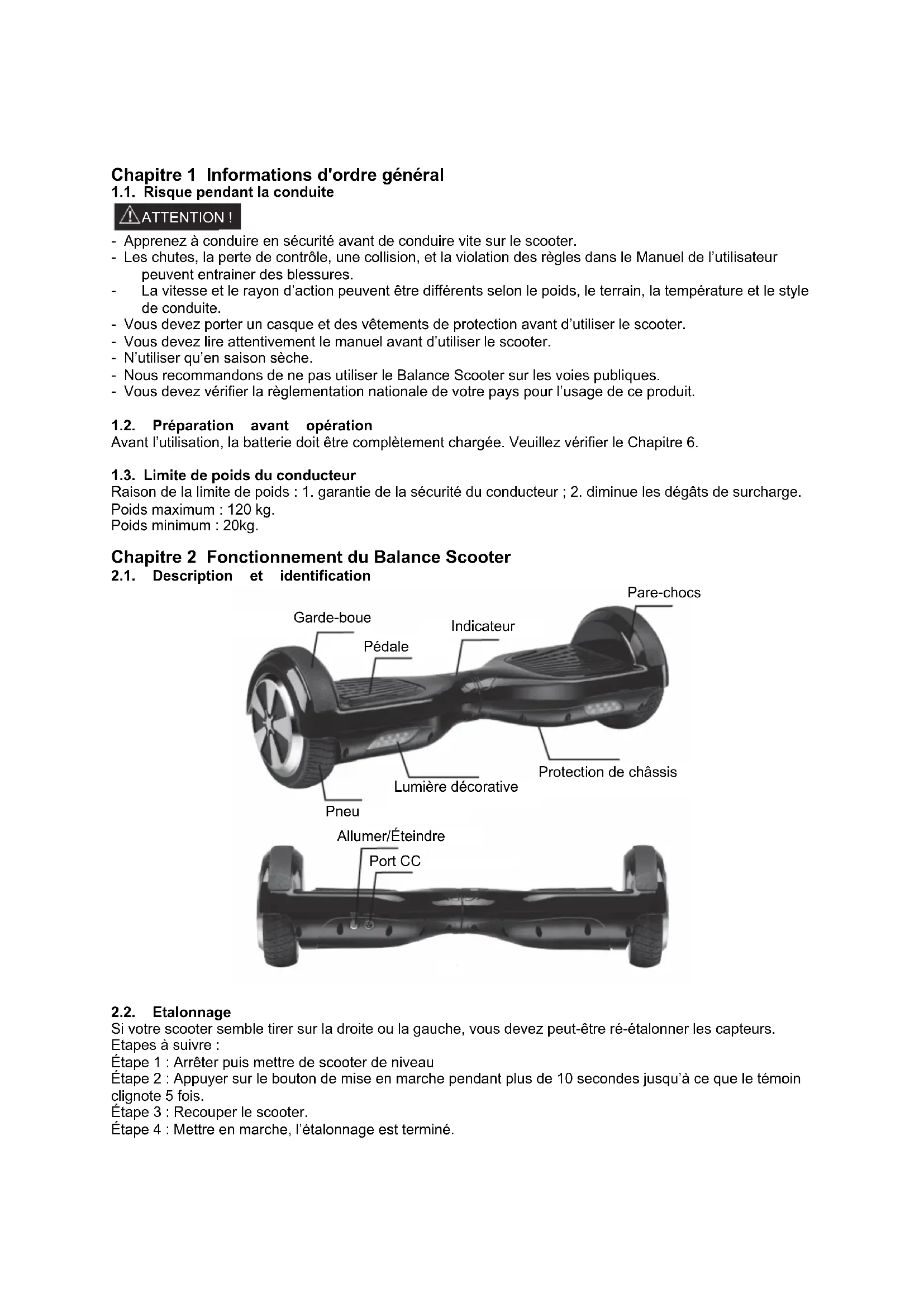 ELECTRONICSChapitre 1 Informations d'ordre général 1.1. Risque pendant la conduite - Apprenez à conduire en sécurité avant de conduire vite sur le scooter. - Les chutes, la perte de contrôle, une collision, et la violation des règles dans le Manuel de l’utilisateur peuvent entrainer des blessures. - La vitesse et le rayon d’action peuvent être différents selon le poids, le terrain, la température et le style de conduite. - Vous devez porter un casque et des vêtements de protection avant d’utiliser le scooter. - Vous devez lire attentivement le manuel avant d’utiliser le scooter. - N’utiliser qu’en saison sèche. - Nous recommandons de ne pas utiliser le Balance Scooter sur les voies publiques. - Vous devez vérifier la règlementation nationale de votre pays pour l’usage de ce produit. 1.2. Préparation avant opération Avant l’utilisation, la batterie doit être complètement chargée. Veuillez vérifier le Chapitre 6. 1.3. Limite de poids du conducteur Raison de la limite de poids : 1. garantie de la sécurité du conducteur ; 2. diminue les dégâts de surcharge. Poids maximum : 120 kg. Poids minimum : 20kg.