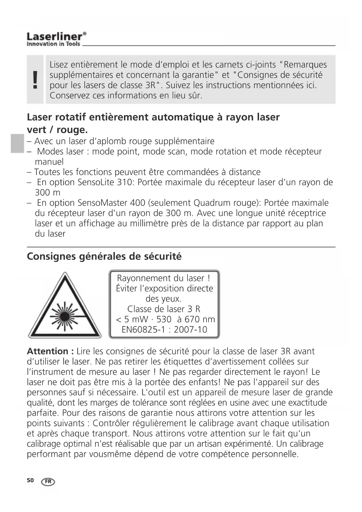 Rayonnement du laser ! Éviter l’exposition directe des yeux. Classe de laser 3 R < 5 mW Ċ 530 à 670 nm EN60825-1 : 2007-10 Attention : Lire les consignes de sécurité pour la classe de laser 3R avant d’utiliser le laser. Ne pas retirer les étiquettes d’avertissement collées sur l’instrument de mesure au laser ! Ne pas regarder directement le rayon! Le laser ne doit pas être mis à la portée des enfants! Ne pas l'appareil sur des personnes sauf si nécessaire. L'outil est un appareil de mesure laser de grande qualité, dont les marges de tolérance sont réglées en usine avec une exactitude parfaite. Pour des raisons de garantie nous attirons votre attention sur les points suivants : Contrôler régulièrement le calibrage avant chaque utilisation et après chaque transport. Nous attirons votre attention sur le fait qu'un calibrage optimal n'est réalisable que par un artisan expérimenté. Un calibrage performant par vousmême dépend de votre compétence personnelle. Consignes générales de sécurité Laser rotatif entièrement automatique à rayon laser vert / rouge. – Avec un laser d‘aplomb rouge supplémentaire – Modes laser : mode point, mode scan, mode rotation et mode récepteur manuel – Toutes les fonctions peuvent être commandées à distance – En option SensoLite 310: Portée maximale du récepteur laser d’un rayon de 300 m – En option SensoMaster 400 (seulement Quadrum rouge): Portée maximale du récepteur laser d’un rayon de 300 m. Avec une longue unité réceptrice laser et un affichage au millimètre près de la distance par rapport au plan du laserQuadrum / Quadrum Green