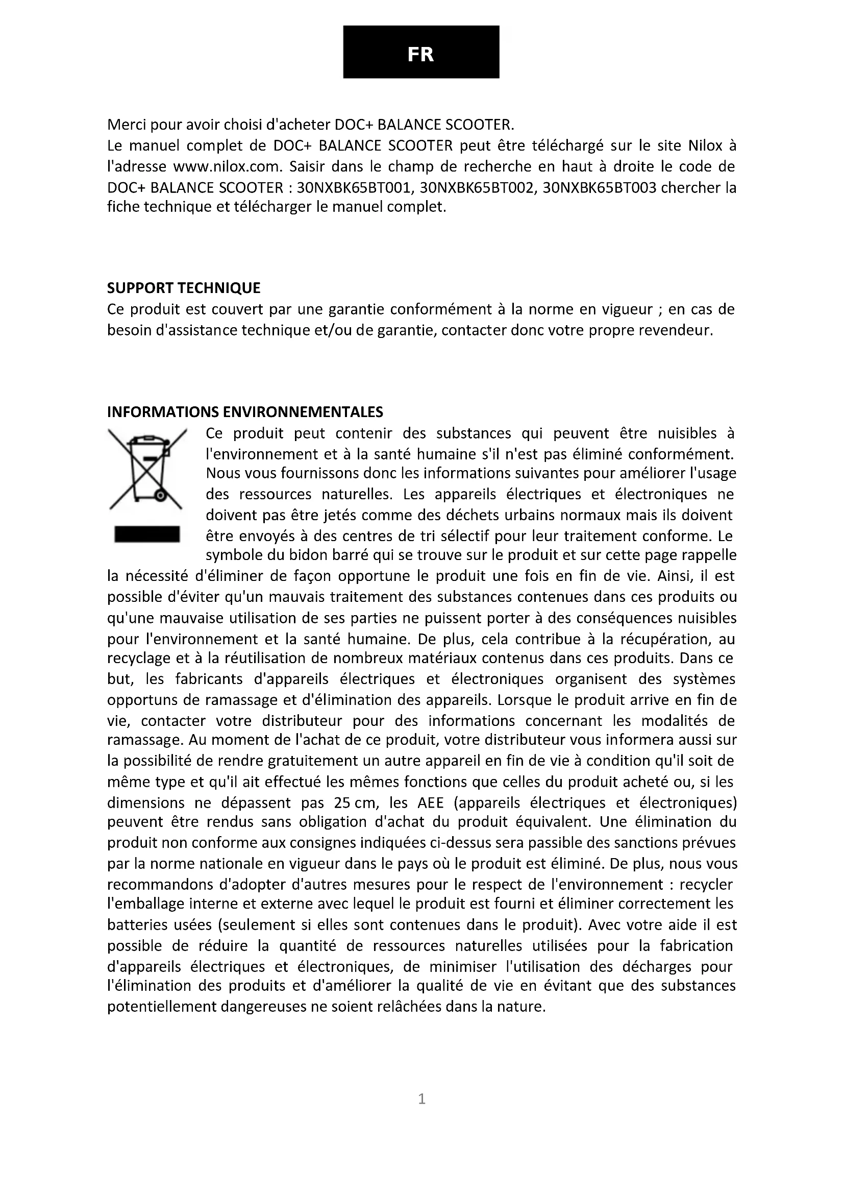 Merci pour avoir choisi d'acheter DOC+ BALANCE SCOOTER. Le manuel complet de DOC+ BALANCE SCOOTER peut être téléchargé sur le site Nilox à l'adresse www.nilox.com. Saisir dans le champ de recherche en haut à droite le code de DOC+ BALANCE SCOOTER : 30NXBK65BT001, 30NXBK65BT002, 30NXBK65BT003 chercher la fiche technique et télécharger le manuel complet.