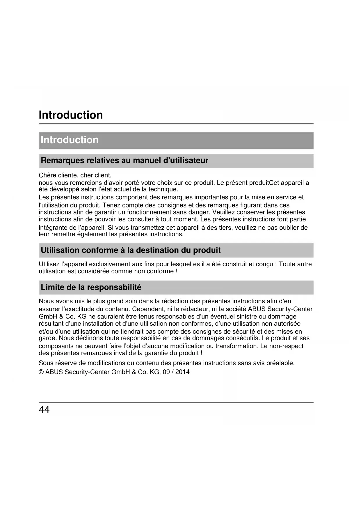 Introduction Remarques relatives au manuel d'utilisateur Chère cliente, cher client, nous vous remercions d’avoir porté votre choix sur ce produit. Le présent produitCet appareil a été développé selon l’état actuel de la technique. Les présentes instructions comportent des remarques importantes pour la mise en service et l'utilisation du produit. Tenez compte des consignes et des remarques figurant dans ces instructions afin de garantir un fonctionnement sans danger. Veuillez conserver les présentes instructions afin de pouvoir les consulter à tout moment. Les présentes instructions font partie intégrante de l’appareil. Si vous transmettez cet appareil à des tiers, veuillez ne pas oublier de leur remettre également les présentes instructions. Utilisation conforme à la destination du produit Utilisez l’appareil exclusivement aux fins pour lesquelles il a été construit et conçu ! Toute autre utilisation est considérée comme non conforme ! Limite de la responsabilité Nous avons mis le plus grand soin dans la rédaction des présentes instructions afin d’en assurer l’exactitude du contenu. Cependant, ni le rédacteur, ni la société ABUS Security-Center GmbH & Co. KG ne sauraient être tenus responsables d’un éventuel sinistre ou dommage résultant d’une installation et d’une utilisation non conformes, d’une utilisation non autorisée et/ou d’une utilisation qui ne tiendrait pas compte des consignes de sécurité et des mises en garde. Nous déclinons toute responsabilité en cas de dommages consécutifs. Le produit et ses composants ne peuvent faire l’objet d’aucune modification ou transformation. Le non-respect des présentes remarques invalide la garantie du produit ! Sous réserve de modifications du contenu des présentes instructions sans avis préalable. © ABUS Security-Center GmbH & Co. KG, 09 / 2014Consignes de sécurité