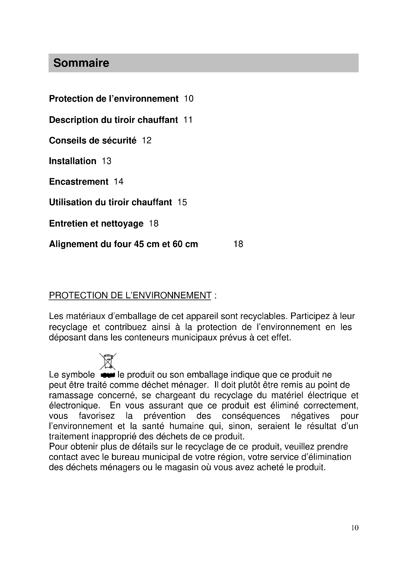 Ce tiroir chauffant a eté concu pour être utilisé par des particuliers dans leur lieu d'habitation. Il est destiné exclusivement à préchauffer la vaisse. Toute autre utilisation est interdite et peut être dangereuse. Le fabricant se dégage de toute responsabilité en cas d'utilisations non conformes.