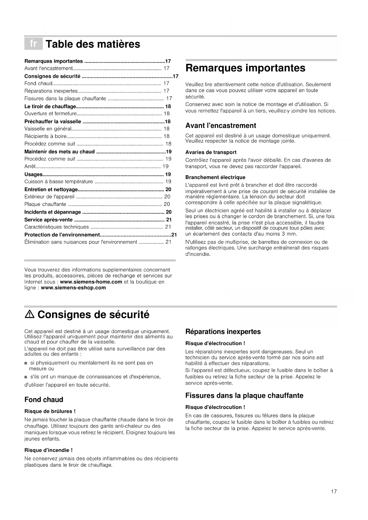 - Élimination sans nuisances pour l'environnement Produktinfo Vous trouverez des informations supplementaires concernant les produits, accessoires, pièces de rechange et services sur Internet sous : www.siemens-home.com et la boutique en ligne : www.siemens-eshop.com Remarques importantes Veuillez lire attentivement cette notice d'utilisation. Seulement dans ce cas vous pouvez utiliser votre appareil en toute sécurité. Conservez avec soin la notice de montage et d'utilisation. Si vous remettez l'appareil à un tiers, veuillez-y joindre les notices. Avant l'encastrement Cet appareil est destiné à un usage domestique uniquement. Veuillez respecter la notice de montage jointe. Avaries de transport Contrôlez l'appareil après l'avoir déballé. En cas d'avaries de transport, vous ne devez pas raccorder l'appareil. Branchement électrique L'appareil est livré prêt à brancher et doit être raccordé impérativement à une prise de courant de sécurité installée de manière réglementaire. La tension du secteur doit correspondre à celle spécifiée sur la plaque signalétique. Seul un électricien agréé est habilité à installer ou à déplacer les prises ou à changer le cordon de branchement. Si, une fois l'appareil encastré, la prise n'est plus accessible, il faudra installer, côté secteur, un dispositif de coupure tous pôles avec un écartement des contacts d'au moins 3 mm. N'utilisez pas de multiprise, de barrettes de connexion ou de rallonges électriques. Une surcharge entraînerait des risques d'incendie. ã=Consignes de sécurité Cet appareil est destiné à un usage domestique uniquement. Utilisez l'appareil uniquement pour maintenir des aliments au chaud et pour chauffer de la vaisselle. L'appareil ne doit pas être utilisé sans surveillance par des adultes ou des enfants : ■ si physiquement ou mentalement ils ne sont pas en mesure ou ■ s'ils ont un manque de connaissances et d'expérience, d'utiliser l'appareil en toute sécurité. Fond chaud Risque de brûlures ! Ne jamais toucher la plaque chauffante chaude dans le tiroir de chauffage. Utilisez toujours des gants anti-chaleur ou des maniques lorsque vous retirez le récipient. Eloignez toujours les jeunes enfants. Risque d'incendie ! Ne conservez jamais des objets inflammables ou des récipients plastiques dans le tiroir de chauffage. Réparations inexpertes Risque d'électrocution ! Les réparations inexpertes sont dangereuses. Seul un technicien du service après-vente formé par nos soins est habilité à effectuer des réparations. Si l'appareil est défectueux, coupez le fusible dans le boîtier à fusibles ou retirez la fiche secteur de la prise. Appelez le service après-vente. Fissures dans la plaque chauffante Risque d'électrocution ! En cas de cassures, fissures ou fêlures dans la plaque chauffante, coupez le fusible dans le boîtier à fusibles ou retirez la fiche secteur de la prise. Appelez le service après-vente.18 Le tiroir de chauffage Dans le tiroir de chauffage vous pouvez préchauffer de la vaisselle ou maintenir des aliments au chaud. L'appareil chauffe uniquement si le tiroir est correctement fermé. Ouverture et fermeture En cas d'appareils sans poignée : Appuyez au milieu du tiroir pour l'ouvrir ou le fermer. Lors de l'ouverture, le tiroir ressort légèrement. Il peut ensuite être facilement retiré. Préchauffer la vaisselle Les mets refroidissent moins vite dans une vaisselle préchauffée. Les boissons restent plus longtemps chaudes. Vaisselle en général Vous pouvez charger le tiroir de chauffage d'un poids maximal de 25 kg. Vous pouvez p.ex. préchauffer de la vaisselle de table pour 6 à 12 personnes. Ranger la vaisselle Si possible, répartissez la vaisselle sur toute la surface. Des assiettes empilées sont chauffées moins rapidement que des pièces de vaisselle individuelles, comme p.ex. 2 terrines. Récipients à boire Chauffer les récipients à boire, tels que tasses à espresso, toujours avec la position 2. ã=Risque de brûlures ! A la puissance 3 ou 4 les récipients à boire deviennent très chauds. Procédez comme suit 1.Ranger la vaisselle dans le tiroir.2.Régler le sélecteur sur la position 4.Pour les récipients à boire, sélectionnez toujours la position 2. Le témoin de service clignote. 3.Fermer le tiroir de chauffage. Le témoin de service est allumé en continu. L'appareil chauffe. Combien de temps dure le préchauffage La durée du préchauffage dépend du matériau et de l'épaisseur de la vaisselle, de la quantité de vaisselle, de la hauteur et de la disposition de la vaisselle. Si possible, répartissez la vaisselle sur toute la surface. En cas de service de table pour 6 personnes, le préchauffage dure environ 15-25 minutes. Arrêt Ouvrez le tiroir. Mettez le sélecteur sur Arrêt. Enlever la vaisselle Enlevez la vaisselle du tiroir en utilisant des maniques ou des gants de cuisine. ã=Risque de brûlures ! La surface de la plaque chauffante est chaude. Les pièces de vaisselle inférieures deviennent plus chaudes que les pièces supérieures. 7pPRLQGHVHUYLFH /RUVTXHYRXVDOOXPH]ODSSDUHLO p. 21