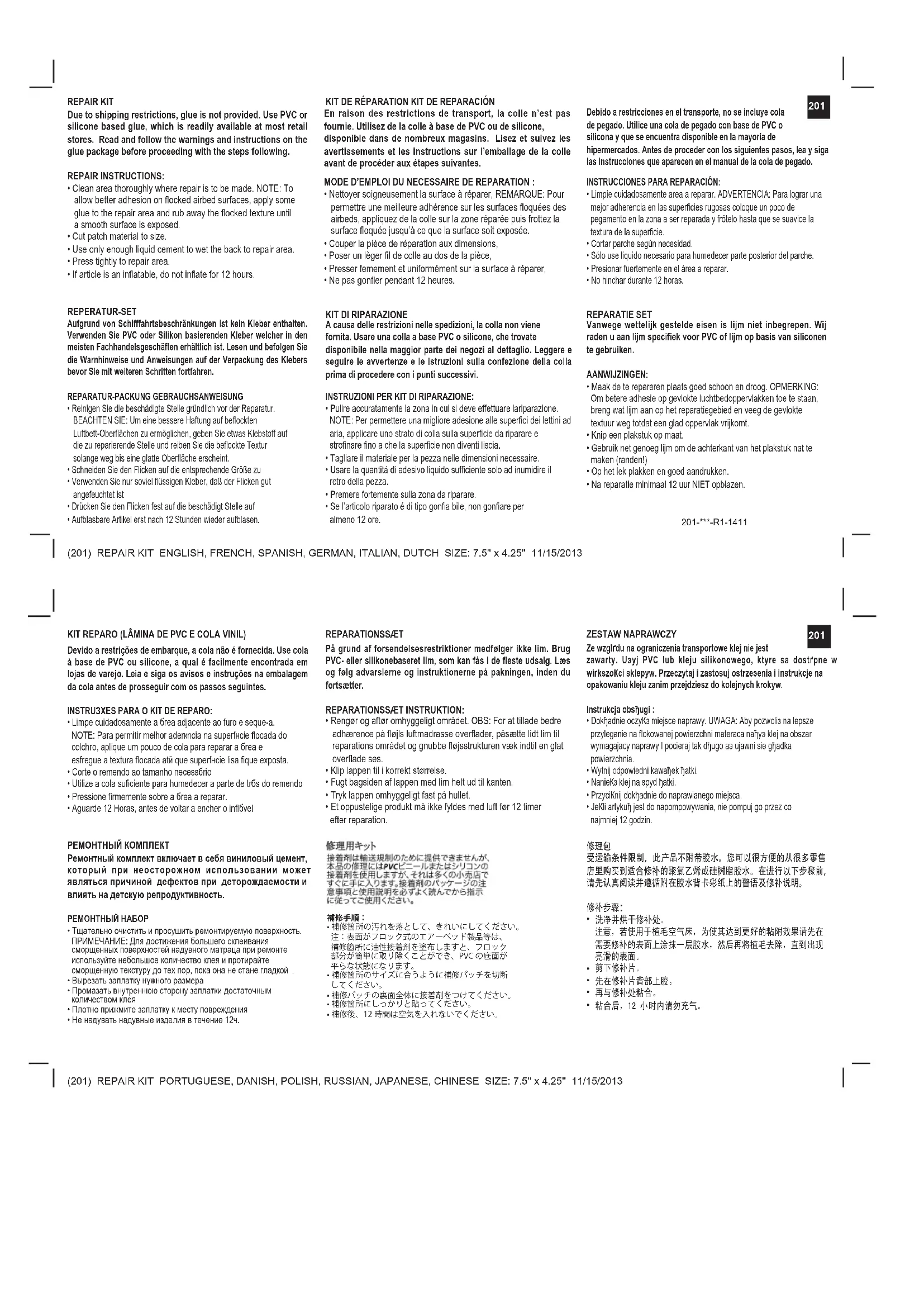 REPARATIE SET KIT DE RÉPARATION KIT DE REPARACIÓN En raison des restrictions de transport, la colle n’est pas fournie. Utilisez de la colle à base de PVC ou de silicone, disponible dans de nombreux magasins. Lisez et suivez les avertissements et les instructions sur l’emballage de la colle avant de procéder aux étapes suivantes. MODE D’EMPLOI DU NECESSAIRE DE REPARATION :