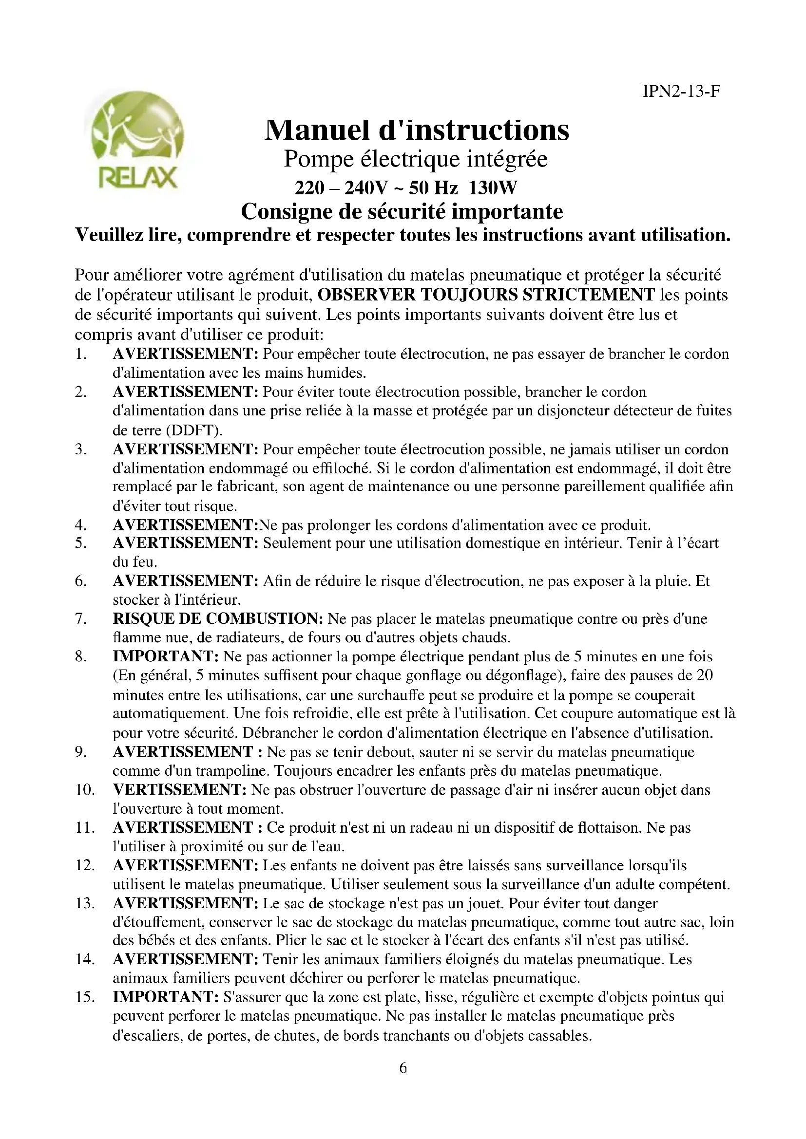 9. AVERTISSEMENT : Ne pas se tenir debout, sauter ni se servir du matelas pneumatique