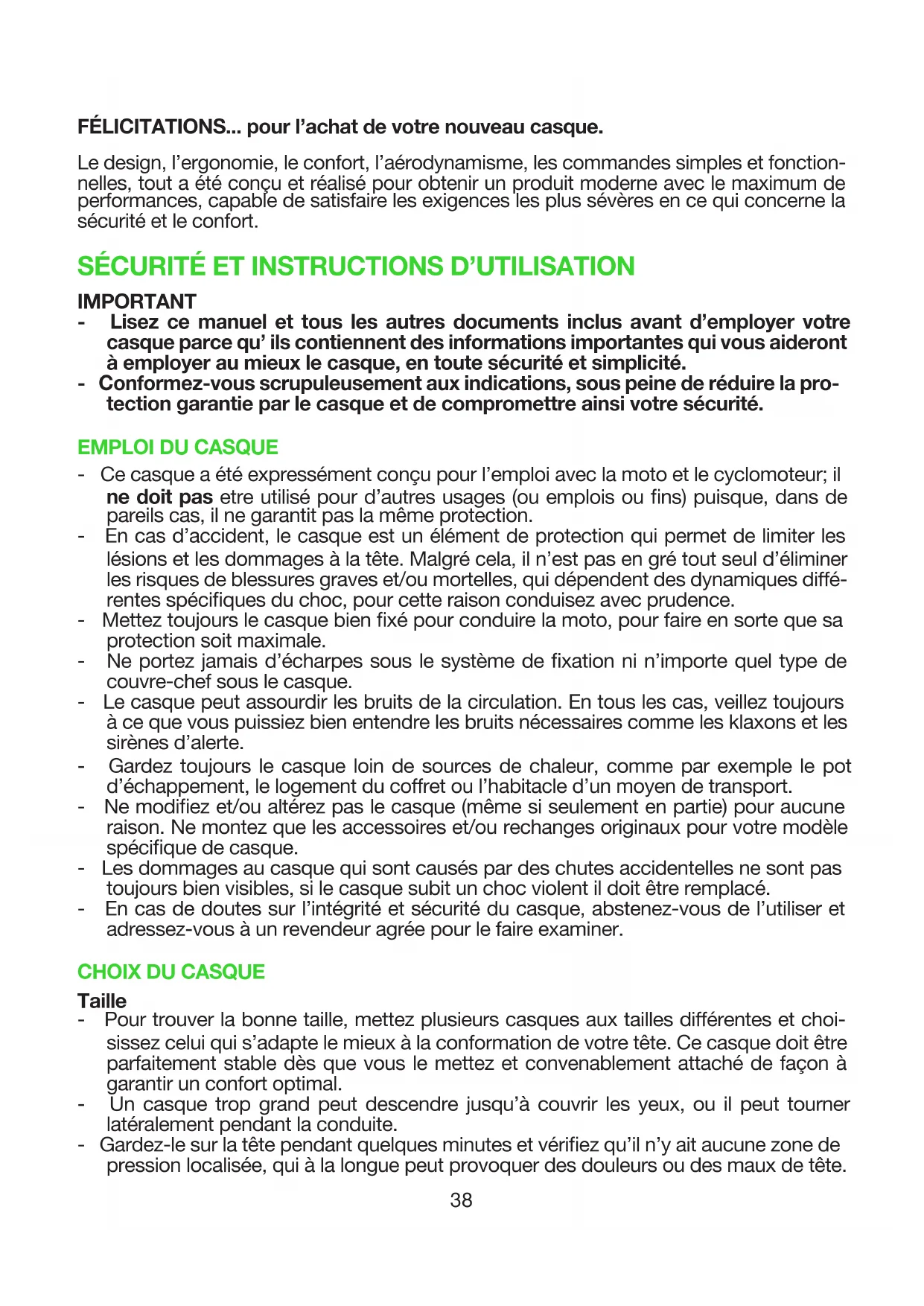 - Ce casque a été expressément conçu pour l’emploi avec la moto et le cyclomoteur; il ne doit pas etre utilisé pour d’autres usages (ou emplois ou ns) puisque, dans de pareils cas, il ne garantit pas la même protection. - En cas d’accident, le casque est un élément de protection qui permet de limiter les lésions et les dommages à la tête. Malgré cela, il n’est pas en gré tout seul d’éliminer les risques de blessures graves et/ou mortelles, qui dépendent des dynamiques diffé- rentes spéciques du choc, pour cette raison conduisez avec prudence. - Mettez toujours le casque bien xé pour conduire la moto, pour faire en sorte que sa protection soit maximale. - Ne portez jamais d’écharpes sous le système de xation ni n’importe quel type de couvre-chef sous le casque. - Le casque peut assourdir les bruits de la circulation. En tous les cas, veillez toujours à ce que vous puissiez bien entendre les bruits nécessaires comme les klaxons et les sirènes d’alerte. - Gardez toujours le casque loin de sources de chaleur, comme par exemple le pot d’échappement, le logement du coffret ou l’habitacle d’un moyen de transport. - Ne modiez et/ou altérez pas le casque (même si seulement en partie) pour aucune raison. Ne montez que les accessoires et/ou rechanges originaux pour votre modèle spécique de casque. - Les dommages au casque qui sont causés par des chutes accidentelles ne sont pas toujours bien visibles, si le casque subit un choc violent il doit être remplacé. - En cas de doutes sur l’intégrité et sécurité du casque, abstenez-vous de l’utiliser et adressez-vous à un revendeur agrée pour le faire examiner.