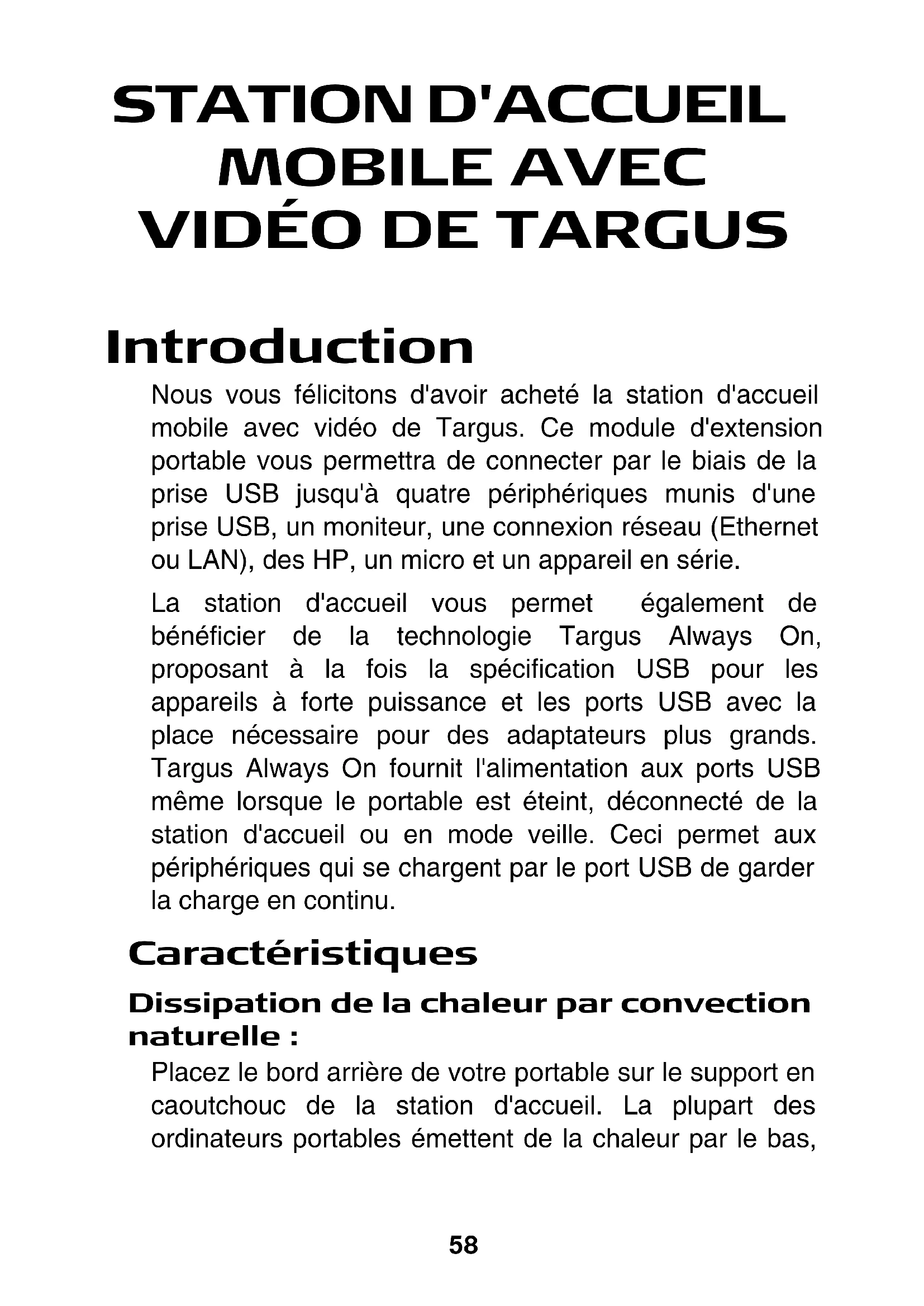 Introduction Nous vous félicitons d'avoir acheté la station d'accueil mobile avec vidéo de Targus. Ce module d'extension portable vous permettra de connecter par le biais de la prise USB jusqu'à quatre périphériques munis d'une prise USB, un moniteur, une connexion réseau (Ethernet ou LAN), des HP, un micro et un appareil en série. La station d'accueil vous permet également de bénéficier de la technologie Targus Always On, proposant à la fois la spécification USB pour les appareils à forte puissance et les ports USB avec la place nécessaire pour des adaptateurs plus grands. Targus Always On fournit l'alimentation aux ports USB même lorsque le portable est éteint, déconnecté de la station d'accueil ou en mode veille. Ceci permet aux périphériques qui se chargent par le port USB de garder la charge en continu. Caractéristiques Dissipation de la chaleur par convection naturelle : Placez le bord arrière de votre portable sur le support en caoutchouc de la station d'accueil. La plupart des ordinateurs portables émettent de la chaleur par le bas,59 Station d'accueil mobile avec vidéo de Targus et plus l'air a de la place pour circuler, meilleures sont les conditions pour la dissipation par convection naturelle. Confort La plate-forme surélevée procure une position plus confortable pour les mains et un flux d'air supérieur pour une meilleure aération. La station d'accueil possède les ports suivants :