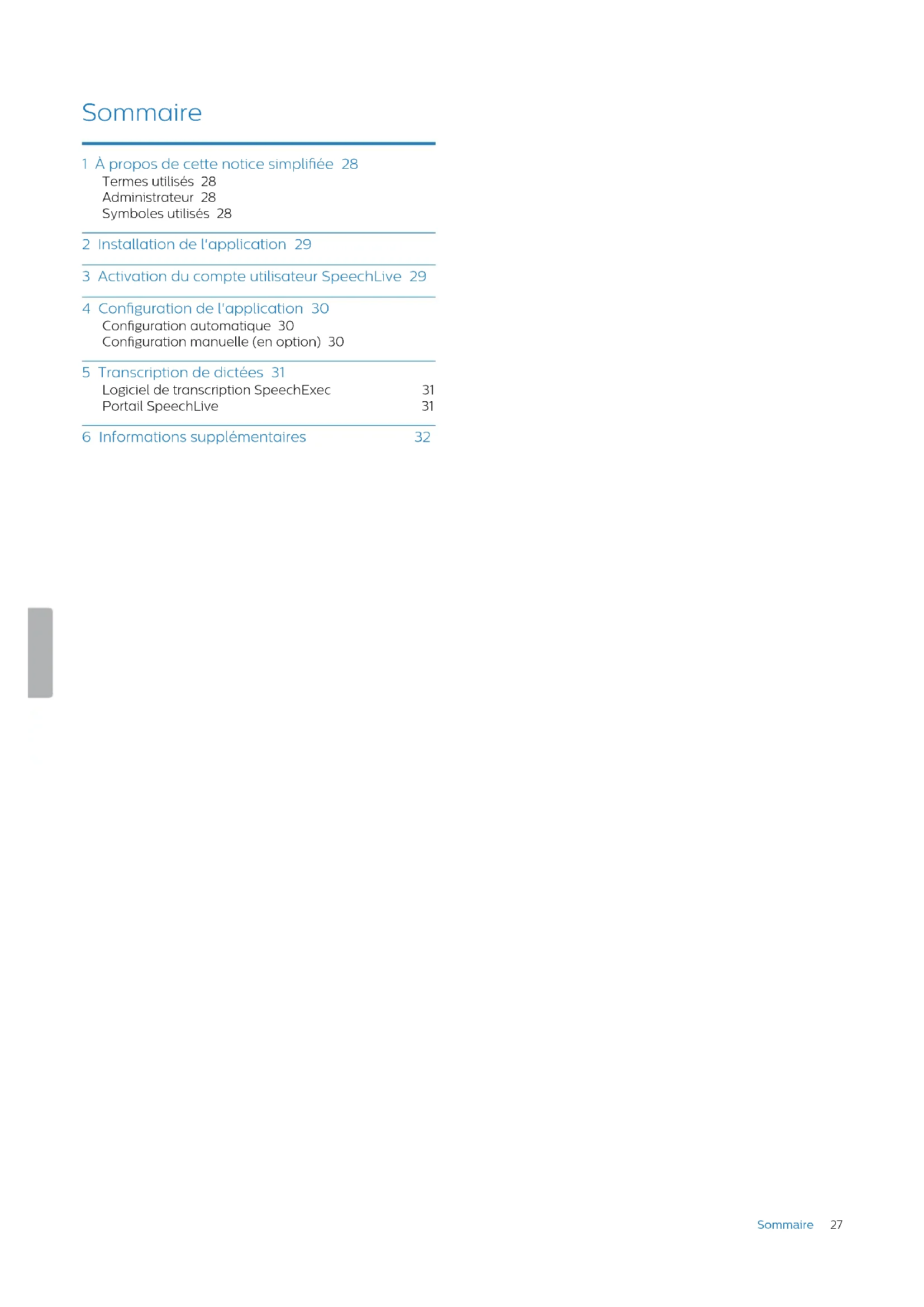 Klik op OK. *) Deze functie is alleen beschikbaar voor transcribeerders met het geavanceerde Business-pakket (PCL1100).24 Meer informatie 6 Meer informatie Meer informatie over SpeechExec Pro Transcribe vindt u in de SpeechExec Pro Transcribe-gebruikshandleiding.25 Noch Speech Processing Solutions GmbH, noch aangesloten rma's zijn tegenover de koper van dit product of derden aansprakelijk voor schadeclaims, verliezen, kosten of uitgaven die de koper of derden moet maken ten gevolge van een ongeval, verkeerd gebruik of misbruik van dit product, of ten gevolge van ongeautoriseerde modicaties, reparaties, wijzigingen van het product, of veronachtzaming van de bedienings- en onderhoudsinstructies van Philips. Deze gebruikshandleiding is een document en geen contract. Vergissingen, drukfouten en wijzigingen zijn voorbehouden. Philips en het Philips-logo zijn gedeponeerde handelsmerken van Koninklijke Philips N.V. en worden door Speech Processing Solutions GmbH gebruikt onder licentie van Koninklijke Philips N.V. Alle gebruikte merken zijn eigendom van de betreende eigenaren.2627 Sommaire 1 À propos de cette notice simpliée 28 Termes utilisés 28 Administrateur 28 Symboles utilisés 28 2 Installation de l'application 29 3 Activation du compte utilisateur SpeechLive 29 4 Conguration de l'application 30 Conguration automatique 30 Conguration manuelle (en option) 30 5 Transcription de dictées 31 Logiciel de transcription SpeechExec 31 Portail SpeechLive 31 6 Informations supplémentaires 32 Sommaire28 À propos de cette notice simpliée 1 À propos de cette notice simpliée Merci d’avoir choisi Philips SpeechLive comme solution de ux de dictée basée dans le cloud. Cette notice simpliée décrit comment activer et congurer votre accès SpeechLive. Si vous avez reçu un e-mail d’invitation en provenance du système SpeechLive, lisez cette notice simpliée avec attention. En tant que transcripteur SpeechLive, vous pouvez transcrire les dictées d’un auteur sur votre ordinateur. Le ux de dictée est géré de manière sécurisée via votre compte utilisateur personnel SpeechLive. Termes utilisés Administrateur Personne qui ajoute les utilisateurs au ux de travail SpeechLive et gère les relations. Auteur Personne qui enregistre les dictées sous forme de chiers audio. Transcripteur Personne qui crée des documents textes à partir des chiers audio (dictées) de l’auteur. Utilisateur Terme qui regroupe les rôles d’auteurs et de transcripteurs. Logiciel Philips SpeechExec Pro Transcribe Ce logiciel permet aux transcripteurs de créer des documents à partir des chiers audio téléchargés. Dans cette notice simpliée, ce logiciel est dénommé logiciel de transcription SpeechExec. Portail SpeechLive Application navigateur web, via laquelle les transcripteurs gèrent leur liste de dictée et renvoient les documents transcrits à l'auteur. Symboles utilisés Astuce