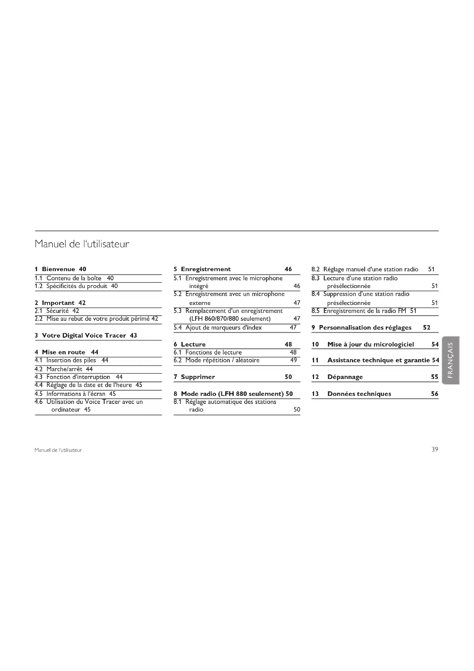 9 Personnalisation des réglages 52 10 Mise à jour du micrologiciel 54 11 Assistance technique et garantie 54 12 Dépannage 55 13 Données techniques 56 FRANÇAIS40 Manuel de l‘utilisateur Bienvenue1 Félicitations pour votre achat et bienvenue chez Philips ! Afin de bénéficier pleinement de l'assistance oerte par Philips, consultez notre site Web pour obtenir des informations sur l'assistance sous la forme de manuels d'utilisation, de téléchargements de logiciels, d'informations sur la garantie et plus encore : www.philips.com/dictation. Contenu de la boîte 1.1 Spécificités du produit1.2 Enregistrement Enregistre au format MP3 courant.• Choisissez entre six modes d'enregistrement. Enregistrement stéréo • PCM non compressé* pour une qualité audio similaire à celle d'un CD, deux modes stéréo (SHQ et HQ) et trois modes monauraux (SP, LP et SLP) pour des durées d'enregistrement prolongées. La sensibilité d'enregistrement réglable évite les bruits de fond et • s'ajuste à l'environnement. Son ample mémoire interne ore une grande capacité • d'enregistrement et permet de stocker de longues dictées. Le mode déclenchement vocal de l'enregistrement permet une • dictée mains libres sans avoir à se rappeler d'appuyer sur le bouton d'enregistrement. La fonction de division automatique divise automatique les longs • enregistrements en fichiers séparés. Vous pouvez ainsi trouver, éditer et archiver beaucoup plus facilement les longs enregistrements tels que les réunions ou les cours. Enregistre avec une alimentation USB sans décharger la batterie.*• Enregistre à partir de sources audio externes par la prise d'entrée • de ligne.* Le grand ratio signal/bruit (s/b) du microphone capte tous les détails • Manuel de l’utilisateur Piles Écouteurs stéréo * Câble USB Microphone à pinceVoice Tracer Dragonne *41 Manuel de l‘utilisateur de la voix humaine, apportant ainsi une excellente reproduction du son. Lecture Vitesse de lecture réglable pour lire les enregistrements en modes de • lecture rapide ou lente. Choisissez de lire un fichier audio partiel ou intégral à répétition • grâce à l'option de lecture à répétition. Écoutez des fichiers de musique MP3 ou WMA ainsi que la radio FM *.• Fonction de réveil avec lecture vocale et enregistrement par minuteur.• Commodité Grand écran rétroéclairé pour faciliter la visualisation.• Profitez de 22 heures de fonctionnement continu.• Transfère rapidement les enregistrements, la musique et les données • grâce au USB 2.0 à haut débit. Les fonctions de marquage d'index et de marquage temporaire • vous permettent de trouver rapidement un emplacement dans un enregistrement. Prend en charge jusqu'à 99 enregistrements dans chacun des quatre • dossiers disponibles, afin d'organiser vos fichiers de façon rapide et facile. En tant que périphérique de stockage de masse USB, le Voice Tracer • propose une façon pratique d'enregistrer, sauvegarder et déplacer des fichiers, sans logiciel précis ni installation de pilote.