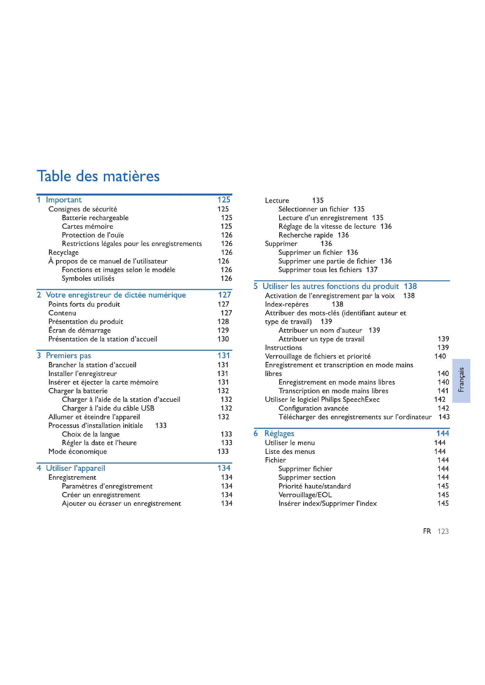 Lecture 135 Sélectionner un fichier 135 Lecture d’un enregistrement 135 Réglage de la vitesse de lecture 136 Recherche rapide 136 Supprimer 136 Supprimer un fichier 136 Supprimer une partie de fichier 136 Supprimer tous les fichiers 137 5 Utiliser les autres fonctions du produit 138 Activation de l’enregistrement par lavoix 138 Index-repères 138 Attribuer des mots-clés (identifiant auteur et type de travail) 139 Attribuer un nom d’auteur 139 Attribuer un type de travail 139 Instructions 139 Verrouillage de fichiers et priorité 140 Enregistrement et transcription en mode mains libres 140 Enregistrement en mode mains libres 140 Transcription en mode mains libres 141 Utiliser le logiciel Philips SpeechExec 142 Configuration avancée 142 Télécharger des enregistrements sur l’ordinateur 143 6 Réglages 144 Utiliser le menu 144 Liste des menus 144 Fichier 144 Supprimer fichier 144 Supprimer section 144 Priorité haute/standard 145 Verrouillage/EOL 145 Insérer index/Supprimer l’index 145 Table des matières 1 Important 125 Consignes de sécurité 125 Batterie rechargeable 125 Cartes mémoire 125 Protection de l’ouïe 126 Restrictions légales pour les enregistrements 126 Recyclage 126 À propos de ce manuel de l’utilisateur 126 Fonctions et images selon le modèle 126 Symboles utilisés 126 2 Votre enregistreur dedictée numérique 127 Points forts du produit 127 Contenu 127 Présentation du produit 128 Écran de démarrage 129 Présentation de la station d’accueil 130 3 Premiers pas 131 Brancher la station d’accueil 131 Installer l’enregistreur 131 Insérer et éjecter la carte mémoire 131 Charger la batterie 132 Charger à l’aide de la station d’accueil 132 Charger à l’aide du câble USB 132 Allumer et éteindre l’appareil 132 Processus d’installation initiale 133 Choix de la langue 133 Régler la date et l’heure 133 Mode économique 133 4 Utiliser l’appareil 134 Enregistrement 134 Paramètres d’enregistrement 134 Créer un enregistrement 134 Ajouter ou écraser un enregistrement 134 Français124 FR Auteur, Type de travail 145 Supprimer tout 145 Inform. sur le fichier 145 Enregistrement 145 Profils 145 Entrée en ligne 146 Bip lors de l’enregistrement 146 Mode d’insertion 146 Chirement 146 Déclenchement vocal 146 Achage 147 Luminosité 147 Éclairage 147 Apparence de l’achage 147 Lamp témoin enreg. 147 Language 147 Appareil 147 Signal sonore 147 Rétroaction acoustique 147 Mode économique 147 Date & heure 147 Interrupteur à curseur 147 Retour automatique 148 Inform. sur le périphérique 148 Formater mémoire 148 Charge USB 148 Audio USB 148 Mode mains libres 148 Fichier de diagnostic 148 Ajustage original 148 Réduction de bruit 148 7 Maintenance 149 Acher les informations sur l’appareil 149 Formater la mémoire 149 Mettre à jour le micrologiciel 149 Résolution des problèmes 150 8 Caractéristiques techniques 151125