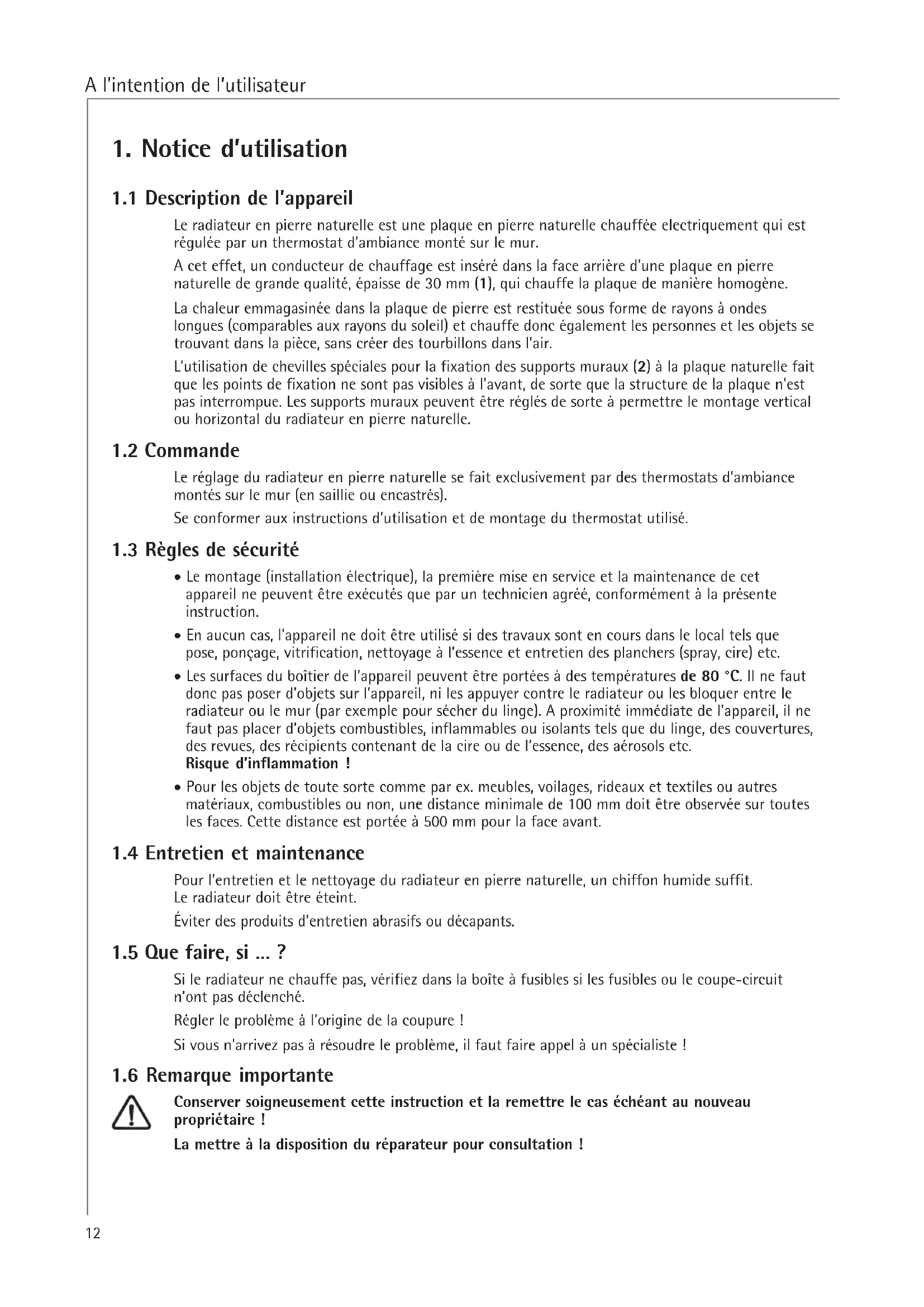 - Les surfaces du boîtier de l’appareil peuvent être portées à des températures de 80 °C. Il ne faut donc pas poser d’objets sur l’appareil, ni les appuyer contre le radiateur ou les bloquer entre le radiateur ou le mur (par exemple pour sécher du linge). A proximité immédiate de l’appareil, il ne faut pas placer d’objets combustibles, inflammables ou isolants tels que du linge, des couvertures, des revues, des récipients contenant de la cire ou de l’essence, des aérosols etc. Risque d’inflammation !