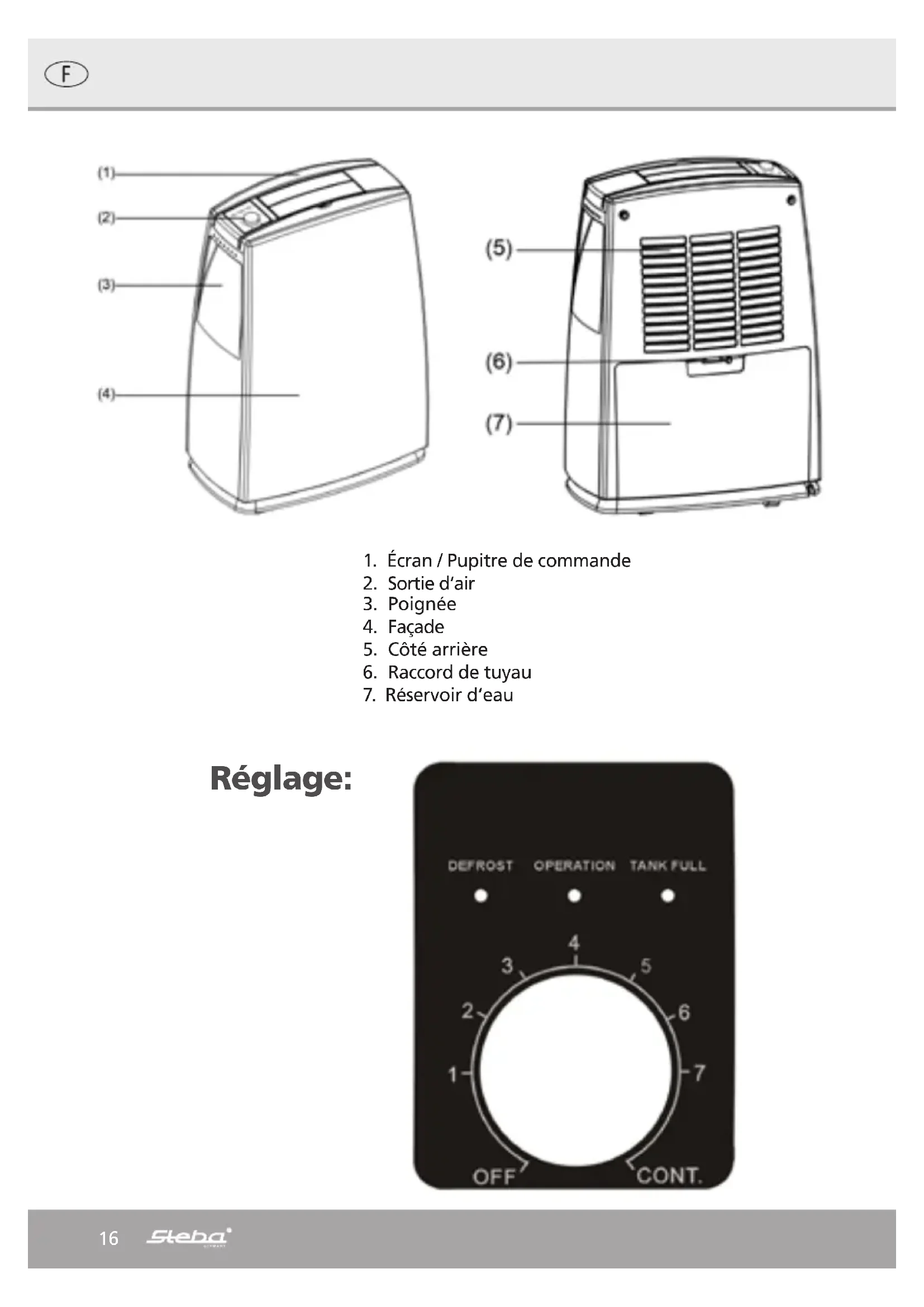 (OPTION A) CONTINUOUS WATER DRAINAGE (OPTION B) FILTER CLEANING Fig. 1 Fig. 3 Fig. 2Fig. 4 Écoulement permanent tuyau21 Dégel Lorsque la température de la pièce est en dessous de 5°C, l‘appareil dégèle. Le compresseur s‘arrête et le ventilateur continue de fonctionner. La lampe „Defrost“ s‘allume sur le pupitre de commande. Entretien et soin Avant de nettoyer l‘appareil, éteindre sur l‘interrupteur marche / arrêt et débrancher la prise ! Vider le réservoir d‘eau chaque jour. Veillez à ne pas endommager le flotteur Rincez toutes les deux semaines avec du liquide vaisselle traditionnel. Ouvrez chaque semaine la grille d‘aspiration situé à l‘arrière et retirez le filtre par le dessous (illustration 4). Rincez le filtre à l‘eau chaude savonneuse et laissez-le sécher. Replacer ensuite le filtre et fermer la grille d‘aspiration. Attention ! L‘appareil est lourd ! Essuyer les surfaces externes avec un chiffon humide. En cas de pause prolongée, le réservoir d‘eau et le filtre d‘aspiration doivent être nettoyés. Stockez l‘appareil à la verticale. Causes des erreurs Problème Cause possible Le déshumidificateur ne travaille pas ∙ Pas de courant (contrôle si le fusible ou la prise sont défectueux) ∙ Réservoir d‘eau trop plein ou pas cor- rectement inséré ∙ Contrôlez que le flotteur se trouve bien dans le réservoir d‘eau. Le déshumidificateur ne crée peu ou pas de condensation ∙ Humidité de l‘air trop faible ∙ Arrivée ou sortie d‘air fermée ou déformée ∙ Les portes ou la fenêtre de la pièce sont ouvertes ∙ Le filtre doit être nettoyé Le déshumidificateur vibre Sol non plan : ∙ placez de la mousse sous l‘appareil22 Evacuation correcte de ce produit: Mettre les appareils usagés immédiatement au rebut. Au sein de l‘UE, ce symbole indique que le produit ne doit pas être jeté avec les déchets ménagers. Les anciens appareils contiennent des matériaux de valeur recyclables qui doivent être valorisés afin d‘éviter toute atteinte à l‘environnement ou à la santé humaine due à une élimination incorrecte des déchets. Les anciens appareils doivent par conséquent être mis au rebut via des systèmes de collecte appropriés ou ramenés à cet effet au point de vente où ils ont été achetés. Les appareils seront alors confiés à un centre de recyclage des matériaux. Élimination de l‘emballage Ne pas jeter l‘emballage avec les déchets ménagers, mais avec les déchets recyclables. Emballage de l‘appareil ∙ Jeter les emballages en papier, carton et carton ondulé aux points de collecte de vieux papiers. ∙ Les composants d‘emballage en plastique et les films doivent également être jetés dans les conteneurs prévus à cet effet. Exemples d‘identification des plastiques : PE pour le polyéthylène, code 02 pour le PEHD, 04 pour le PEBD, PP pour le polypropylène, PS pour le polystyrène. Service après-vente Si, contre toute attente, l‘appareil doit être confié au service après-vente, nous con- tacter aux coordonnées suivantes. En cas de garantie applicable, nous nous charge- ons de l‘enlèvement de l‘appareil. L‘appareil doit être correctement emballé pour le transport. Les paquets non affranchis ne pourront pas être pris en charge ! STEBA Elektrogeräte GmbH & Co KG Pointstr. 2, 96129 Strullendorf / Allemagne tél. service commercial : 09543 / 449-17 / -18, tél. S.A.V. : 09543 / 449-44, fax : 09543 / 449-19 e-mail : elektro@steba.com Internet : http://www.steba.com Attention ! Les appareils électriques doivent être réparés exclusivement par des élec- triciens qualifiés, les réparations non conformes pouvant entraîner des conséquences graves.23