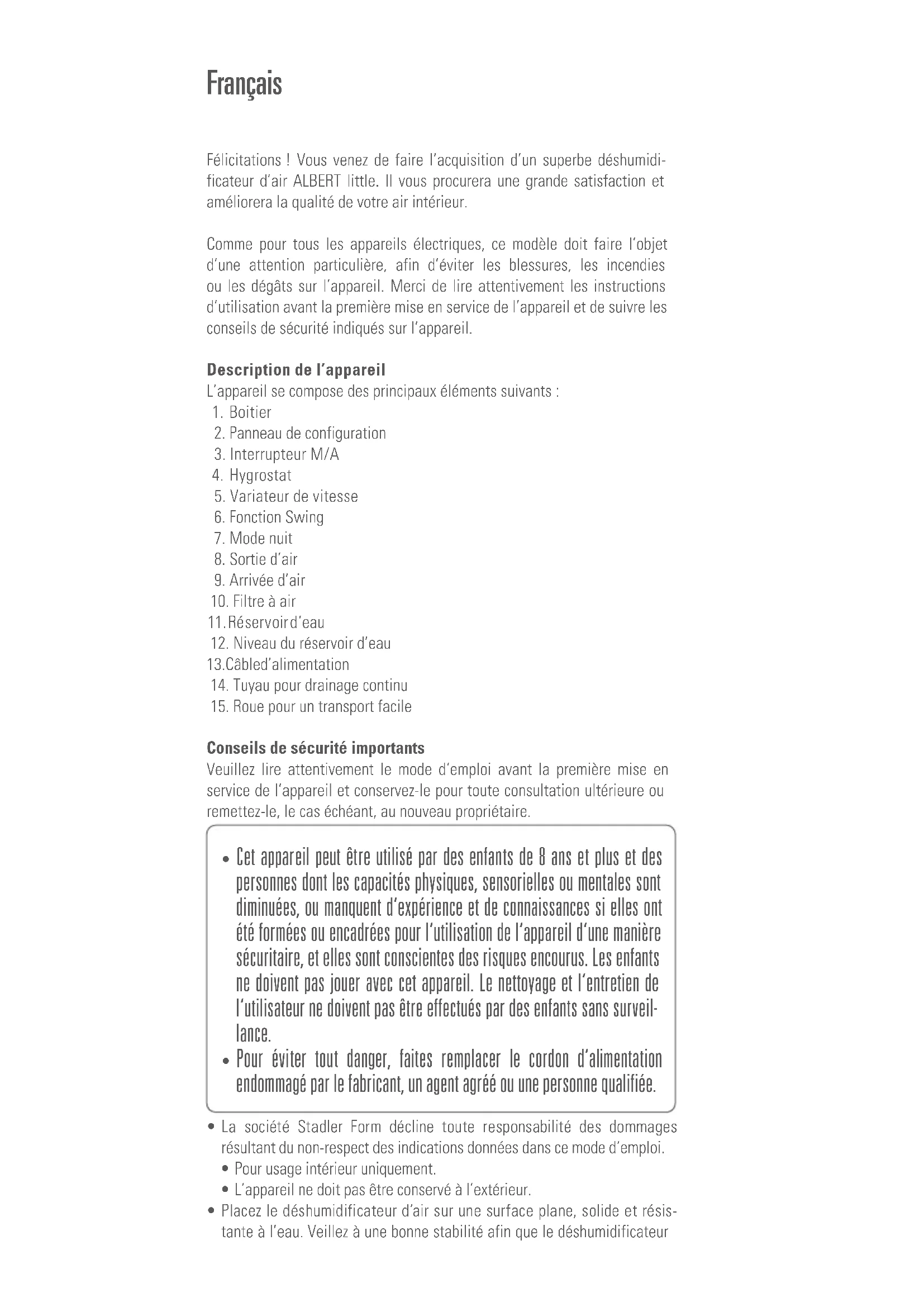 Albert little - Déshumidificateur STADLERFORM - Notice d'utilisation et mode d'emploi gratuit