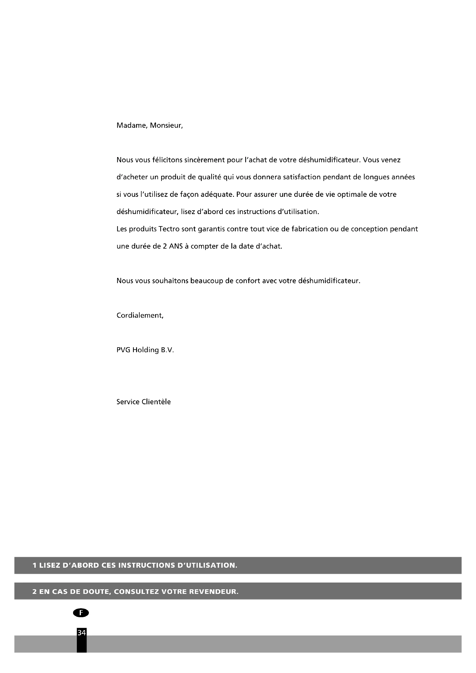 Madame, Monsieur, Nous vous félicitons sincèrement pour l’achat de votre déshumidificateur. Vous venez d’acheter un produit de qualité qui vous donnera satisfaction pendant de longues années si vous l’utilisez de façon adéquate. Pour assurer une durée de vie optimale de votre déshumidificateur, lisez d’abord ces instructions d’utilisation. Les produits Tectro sont garantis contre tout vice de fabrication ou de conception pendant une durée de 2 ANS à compter de la date d’achat. Nous vous souhaitons beaucoup de confort avec votre déshumidificateur. Cordialement, PVG Holding B.V. Service ClientèlePIÈCES PRINCIPALES Tableau de commande Bouton de réglage/ hygrostat Sortie d’air Réservoir d’eau amovible Entrée d’air Filtre à air Embout d’évacuation d’eau (ø 13 mm) avec bouchon Cordon d’alimentation Poignée