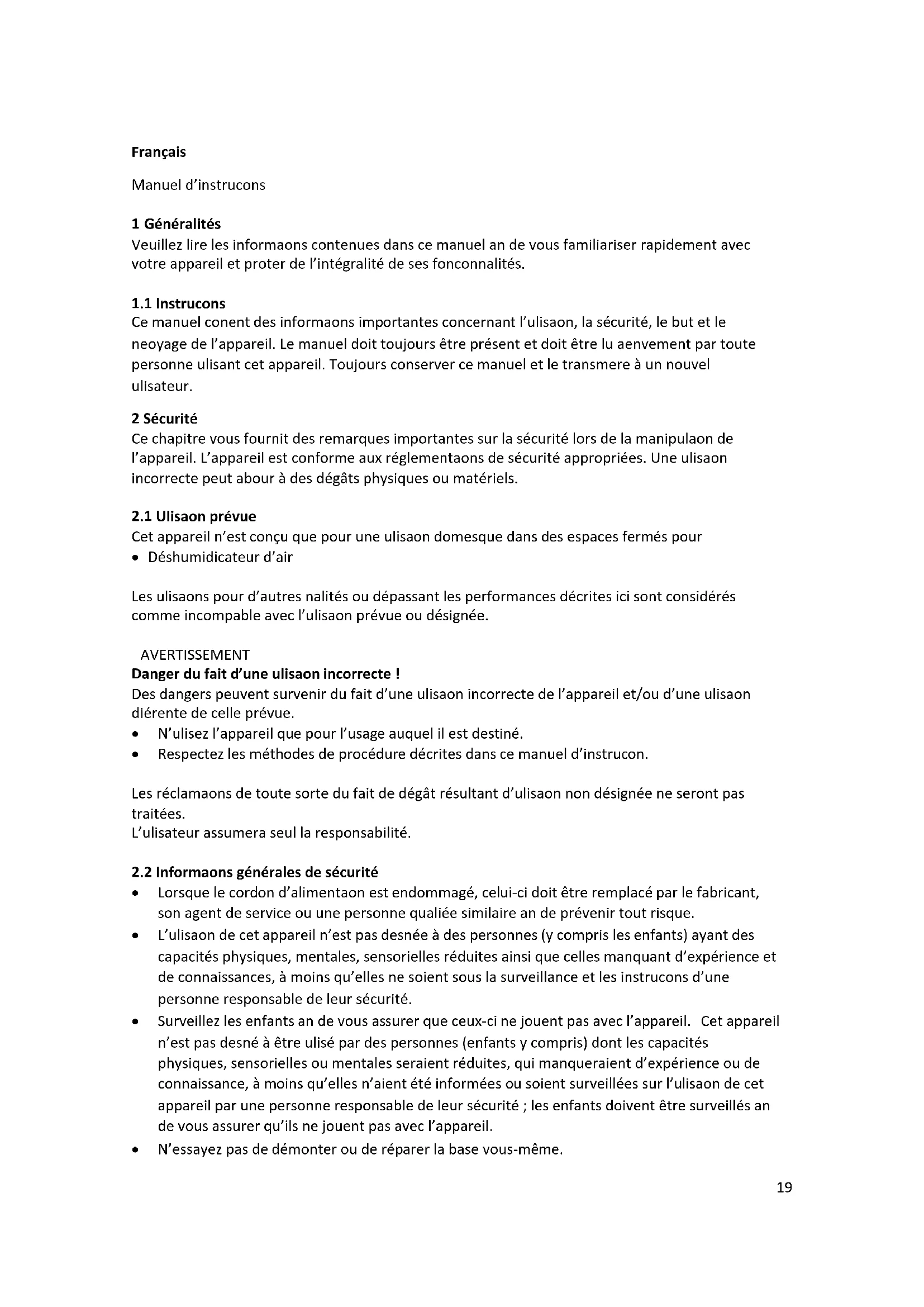 Cet appareil n’est conçu que pour une utilisation domestique dans des espaces fermés pour Déshumidificateur d’air Les utilisations pour d’autres finalités ou dépassant les performances décrites ici sont considérés comme incompatible avec l’utilisation prévue ou désignée. AVERTISSEMENT Danger du fait d’une utilisation incorrecte ! Des dangers peuvent survenir du fait d’une utilisation incorrecte de l’appareil et/ou d’une utilisation différente de celle prévue. N’utilisez l’appareil que pour l’usage auquel il est destiné. Respectez les méthodes de procédure décrites dans ce manuel d’instruction. Les réclamations de toute sorte du fait de dégât résultant d’utilisation non désignée ne seront pas traitées. L’utilisateur assumera seul la responsabilité.