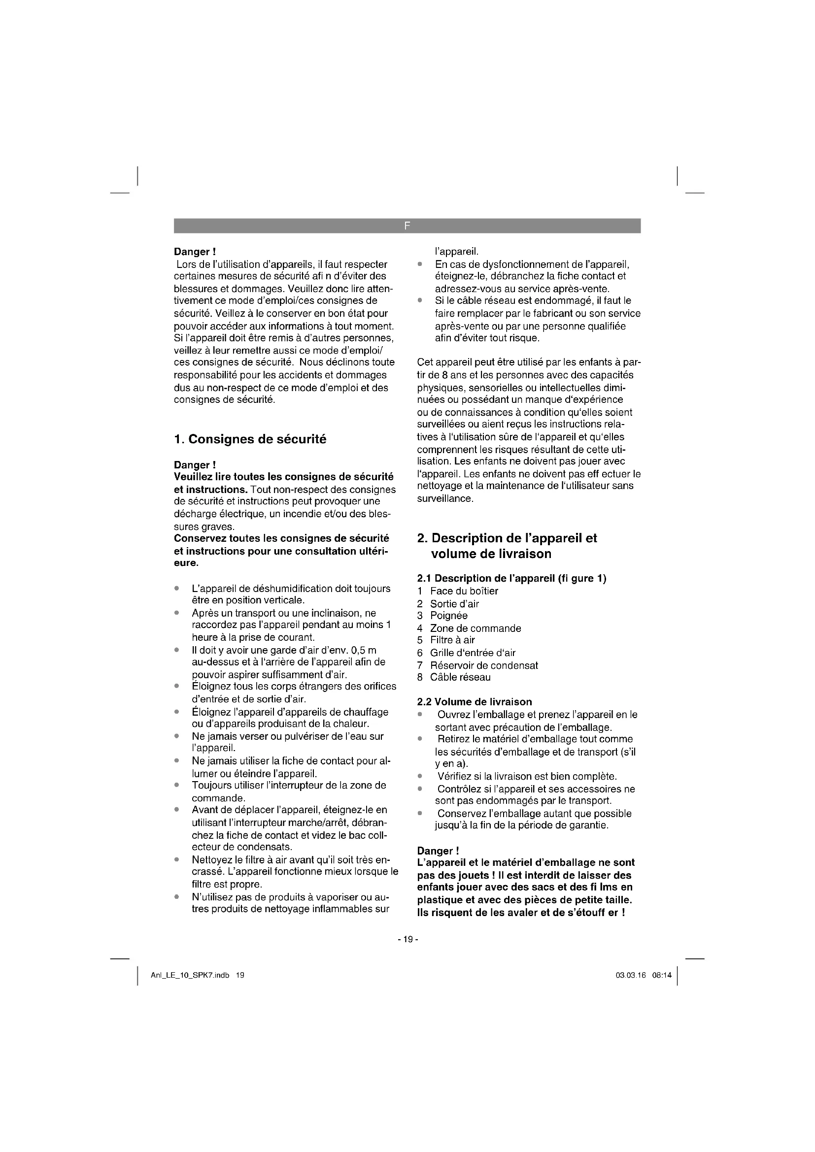 Conservez l’emballage autant que possible jusqu’à la fin de la période de garantie. Danger ! L’appareil et le matériel d’emballage ne sont pas des jouets ! Il est interdit de laisser des enfants jouer avec des sacs et des fi lms en plastique et avec des pièces de petite taille. Ils risquent de les avaler et de s’étouff er ! Anl_LE_10_SPK7.indb 19Anl_LE_10_SPK7.indb 19 03.03.16 08:1403.03.16 08:14F