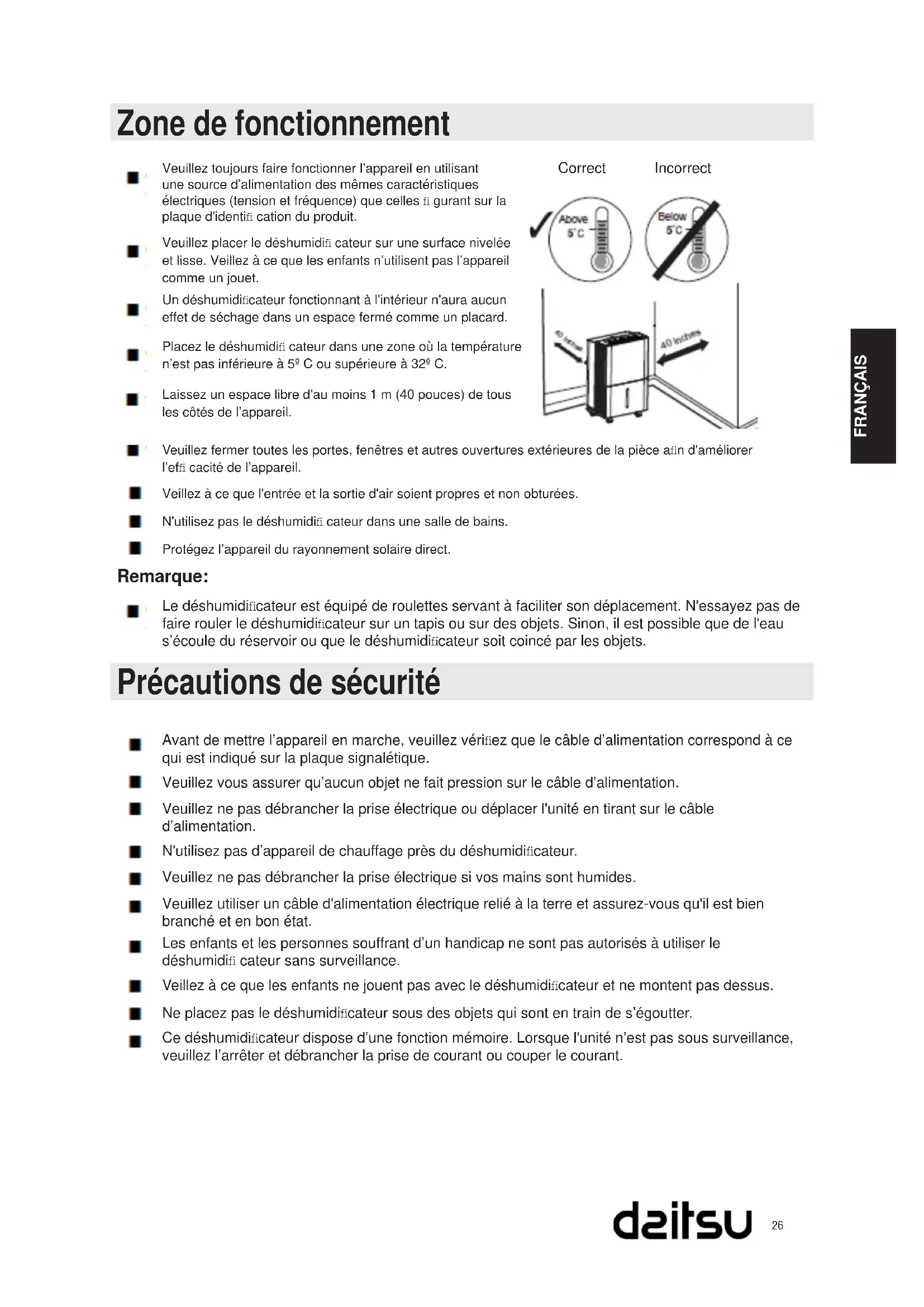 - Spécifi cations (Les graphiques de ce manuel ne sont qu’indicatifs. Pour les détails spécifi ques, veuillez vous référer aux produits réels.)26 FRANÇAIS Zone de fonctionnement Veuillez toujours faire fonctionner l’appareil en utilisant une source d’alimentation des mêmes caractéristiques électriques (tension et fréquence) que celles fi gurant sur la plaque d'identifi cation du produit. Correct Incorrect Veuillez placer le déshumidifi cateur sur une surface nivelée et lisse. Veillez à ce que les enfants n’utilisent pas l’appareil comme un jouet. Un déshumidifi cateur fonctionnant à l'intérieur n'aura aucun effet de séchage dans un espace fermé comme un placard. Placez le déshumidifi cateur dans une zone où la température n’est pas inférieure à 5º C ou supérieure à 32º C. Laissez un espace libre d’au moins 1 m (40 pouces) de tous les côtés de l’appareil. Veuillez fermer toutes les portes, fenêtres et autres ouvertures extérieures de la pièce afi n d'améliorer l’effi cacité de l’appareil. Veillez à ce que l'entrée et la sortie d'air soient propres et non obturées. N'utilisez pas le déshumidifi cateur dans une salle de bains. Protégez l’appareil du rayonnement solaire direct. Remarque: Le déshumidifi cateur est équipé de roulettes servant à faciliter son déplacement. N'essayez pas de faire rouler le déshumidifi cateur sur un tapis ou sur des objets. Sinon, il est possible que de l'eau s’écoule du réservoir ou que le déshumidifi cateur soit coincé par les objets. Précautions de sécurité Avant de mettre l’appareil en marche, veuillez vérifi ez que le câble d’alimentation correspond à ce qui est indiqué sur la plaque signalétique. Veuillez vous assurer qu’aucun objet ne fait pression sur le câble d’alimentation. Veuillez ne pas débrancher la prise électrique ou déplacer l'unité en tirant sur le câble d’alimentation. N'utilisez pas d’appareil de chauffage près du déshumidifi cateur. Veuillez ne pas débrancher la prise électrique si vos mains sont humides. Veuillez utiliser un câble d'alimentation électrique relié à la terre et assurez-vous qu'il est bien branché et en bon état. Les enfants et les personnes souffrant d’un handicap ne sont pas autorisés à utiliser le déshumidifi cateur sans surveillance. Veillez à ce que les enfants ne jouent pas avec le déshumidifi cateur et ne montent pas dessus. Ne placez pas le déshumidifi cateur sous des objets qui sont en train de s’égoutter. Ce déshumidifi cateur dispose d’une fonction mémoire. Lorsque l'unité n’est pas sous surveillance, veuillez l’arrêter et débrancher la prise de courant ou couper le courant.27 FRANÇAIS Précautions de sécurité Veuillez ne pas réparer ou démonter l'unité vous-même. Si le câble d’alimentation est endommagé, il devra être remplacé par des techniciens qualifi és ou par le fabricant. En cas d’anomalie (odeur de brûlé par exemple), veuillez débrancher immédiatement l’appareil puis contactez votre revendeur local. Vous ne pouvez pas vous débarrasser du déshumidifi cateur n’importe où. Si vous voulez vous débarrasser de ce déshumidifi cateur, veuillez vérifi er la législation locale concernant le traitement des déchets ou contactez le service d'information.28 FRANÇAIS Nom des pièces Avant Arrière Accessoires : p. 36