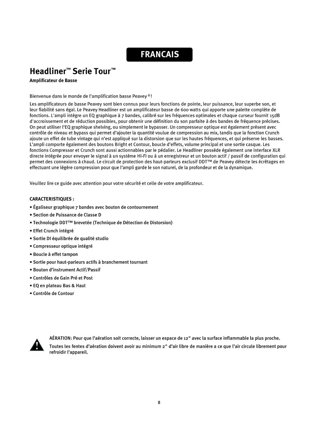 Les amplificateurs de basse Peavey sont bien connus pour leurs fonctions de pointe, leur puissance, leur superbe son, et leur fiabilité sans égal. Le Peavey Headliner est un amplificateur basse de 600 watts qui apporte une palette complète de fonctions. L'ampli intègre un EQ graphique à 7 bandes, calibré sur les fréquences optimales et chaque curseur fournit 15dB d'accroissement et de réduction possibles, pour obtenir une définition du son parfaite à des bandes de fréquence précises. On peut utiliser l’EQ graphique shelving, ou simplement le bypasser. Un compresseur optique est également présent avec contrôle de niveau et bypass qui permet d’ajouter la quantité voulue de compression au mix, tandis que la fonction Crunch ajoute un effet de tube vintage qui n’est appliqué sur la distorsion que sur les hautes fréquences, et qui préserve les basses. L’ampli comporte également des boutons Bright et Contour, boucle d’effets, volume principal et une sortie casque. Les fonctions Compressor et Crunch sont aussi actionnables par le pédalier. Le Headliner possède également une interface XLR directe intégrée pour envoyer le signal à un système HI-FI ou à un enregistreur et un bouton actif / passif de configuration qui permet des connexions à chaud. Le circuit de protection des haut-parleurs exclusif DDT™ de Peavey détecte les écrêtages en effectuant une légère compression pour que l’ampli garde le son naturel, de la profondeur et de la dynamique. Veuillez lire ce guide avec attention pour votre sécurité et celle de votre amplificateur. CARACTERISTIQUES :