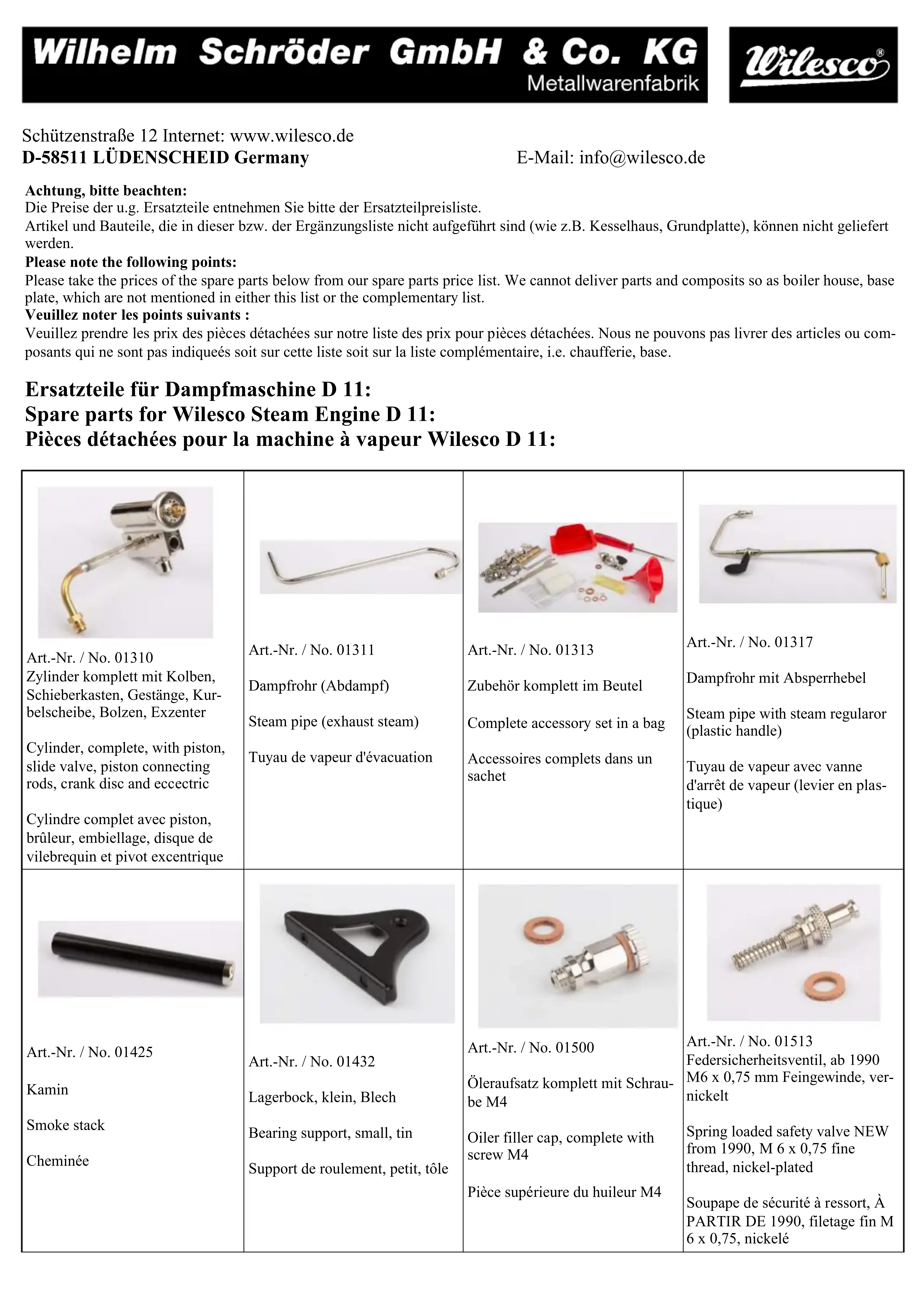 Pièces détachées pour la machine à vapeur wilesco d 11:
