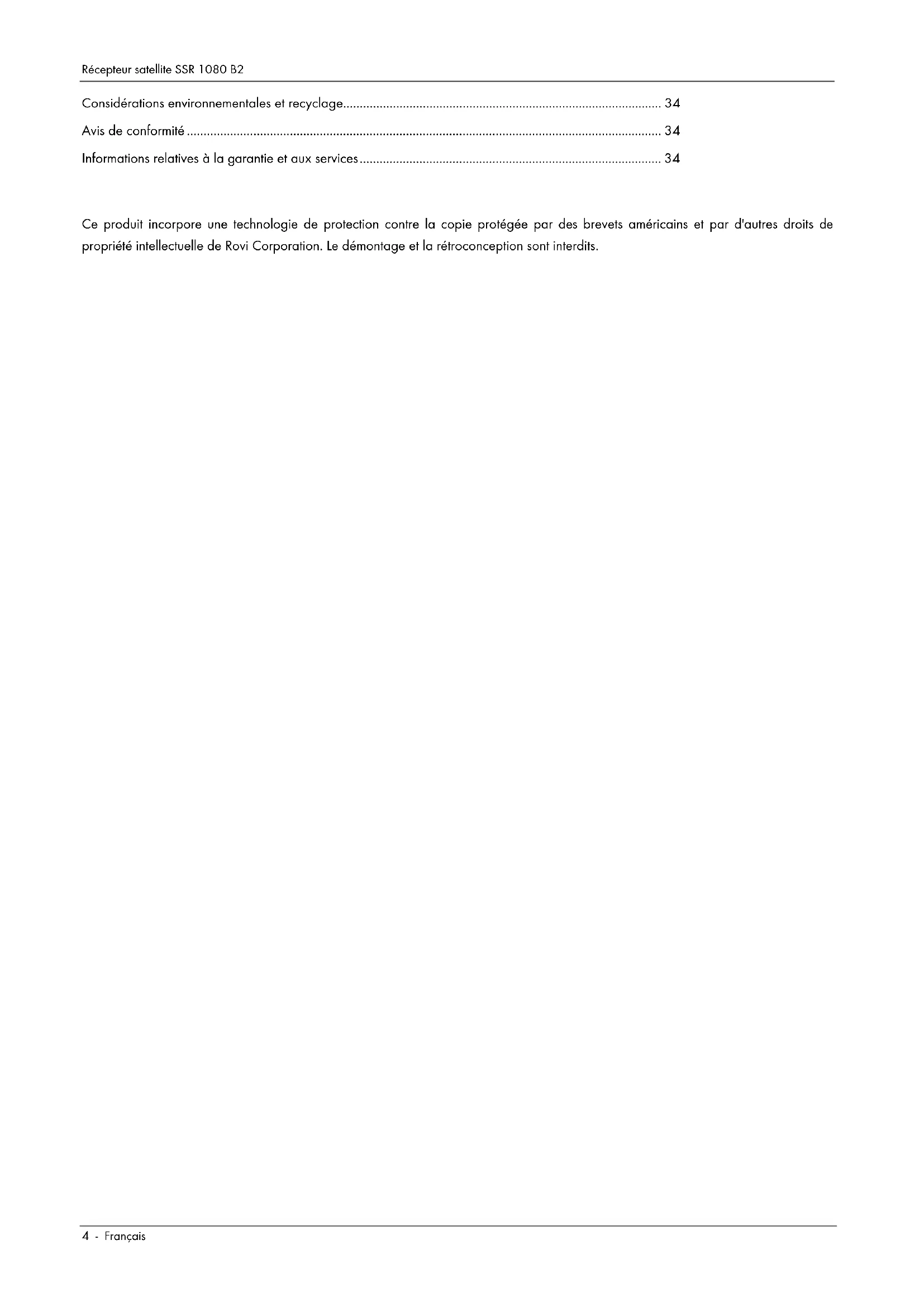 Considérations environnementales et recyclage ................................................................................................ 34 Avis de conformité ............................................................................................................................................... 34 Informations relatives à la garantie et aux services ........................................................................................... 34 Ce produit incorpore une technologie de protection contre la copie protégée par des brevets américains et par d'autres droits de propriété intellectuelle de Rovi Corporation. Le démontage et la rétroconception sont interdits.Récepteur satellite SSR 1080 B2 Français - 5 Introduction Nous vous remercions d'avoir acheté ce récepteur satellite SilverCrest SSR 1080 B2. Le SilverCrest SSR 1080 B2 est un récepteur numérique servant à recevoir des programmes satellites non cryptés. Il nécessite une antenne satellite numérique. Ce récepteur satellite se caractérise par une sortie HDMI de qualité supérieure pour la connexion aux téléviseurs plasma, LCD ou DEL. Le signal vidéo numérique offre une qualité d'image optimale. La netteté et la profondeur de l'image sont nettement améliorées par rapport aux signaux transférés par connexion Péritel (Euro AV) classique. En outre, ce récepteur dispose d’un emplacement Common Interface compatible PCMCIA permettant l’insertion de modules CI/CI+. Utilisation prévue Cet appareil est un appareil électronique grand public. Il nécessite une antenne satellite numérique. Il est destiné à un usage exclusivement privé, et en aucun cas à un usage industriel ou commercial. Il doit être utilisé en intérieur et dans des climats tempérés. Utilisez uniquement des câbles et des périphériques externes conformes aux normes de sécurité, de compatibilité électromagnétique et de blindage de l’appareil. Cet appareil satisfait à toutes les normes de conformité CE et aux autres normes applicables. Toute modification apportée à l’appareil peut avoir pour conséquence que ces normes ne sont plus respectées. Le fabricant ne pourra être tenu pour responsable des dommages ou interférences provoqués suite au non-respect des instructions ci-dessus. Utilisez uniquement les accessoires recommandés par le fabricant. Toute utilisation autre que celle mentionnée ci-dessus ne correspond pas à l’utilisation prévue. Si vous utilisez l’appareil dans un pays autre que la République d’Allemagne, veillez à respecter les normes et la législation en vigueur dans le pays concerné. Contenu de l’emballage Vérifiez que l'emballage contient tous les éléments mentionnés dans la liste suivante : - Récepteur satellite numérique HD SilverCrest SSR 1080 B2 - Télécommande - 2 piles de marque de type AAA, 1,5 V (Micro) - Le présent manuel d'utilisation Si vous constatez qu’il manque certains éléments ou que certains éléments sont endommagés, veuillez contacter notre assistance téléphonique. Vous trouverez le numéro de téléphone correspondant dans le dernier chapitre « Informations relatives à la garantie et aux services ». Caractéristiques techniques Informations générales Dimensions (L x H x P) 260 x 50 x 230 mm Poids environ 1,3 kg Température de fonctionnement 5 à 35 ºC Humidité de fonctionnement 75 % max. d'humidité relative Tension d'entrée 230 V c.a. / 50 Hz Consommation électrique Mode Veille < 1 W En marche 23 W max. Programmes prédéfinis 5 000 Écran 4 caractères Télétexte Capacité de stockage de 800 pages Common Interface CI / CI+ Événements programmés max. 10 événements